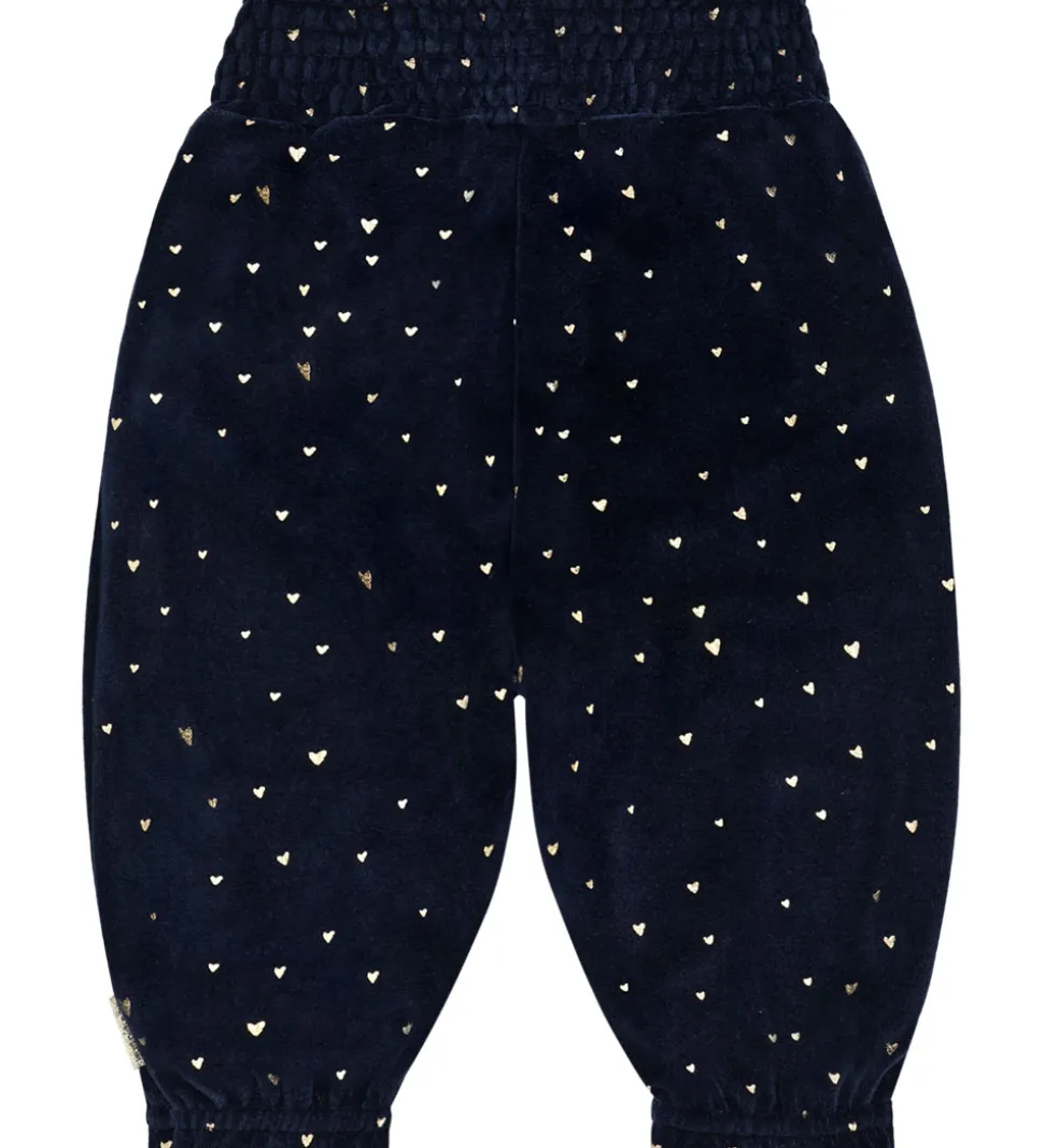 Flotte Hust and Claire velourbukser i navy velour med et print med små, guldfarvede hjerter. Hust and Claire velourbukserne har lange ben med elastikkanter, og i livet er der en bred elastikkant. Fortil sidder der to søde flæser.