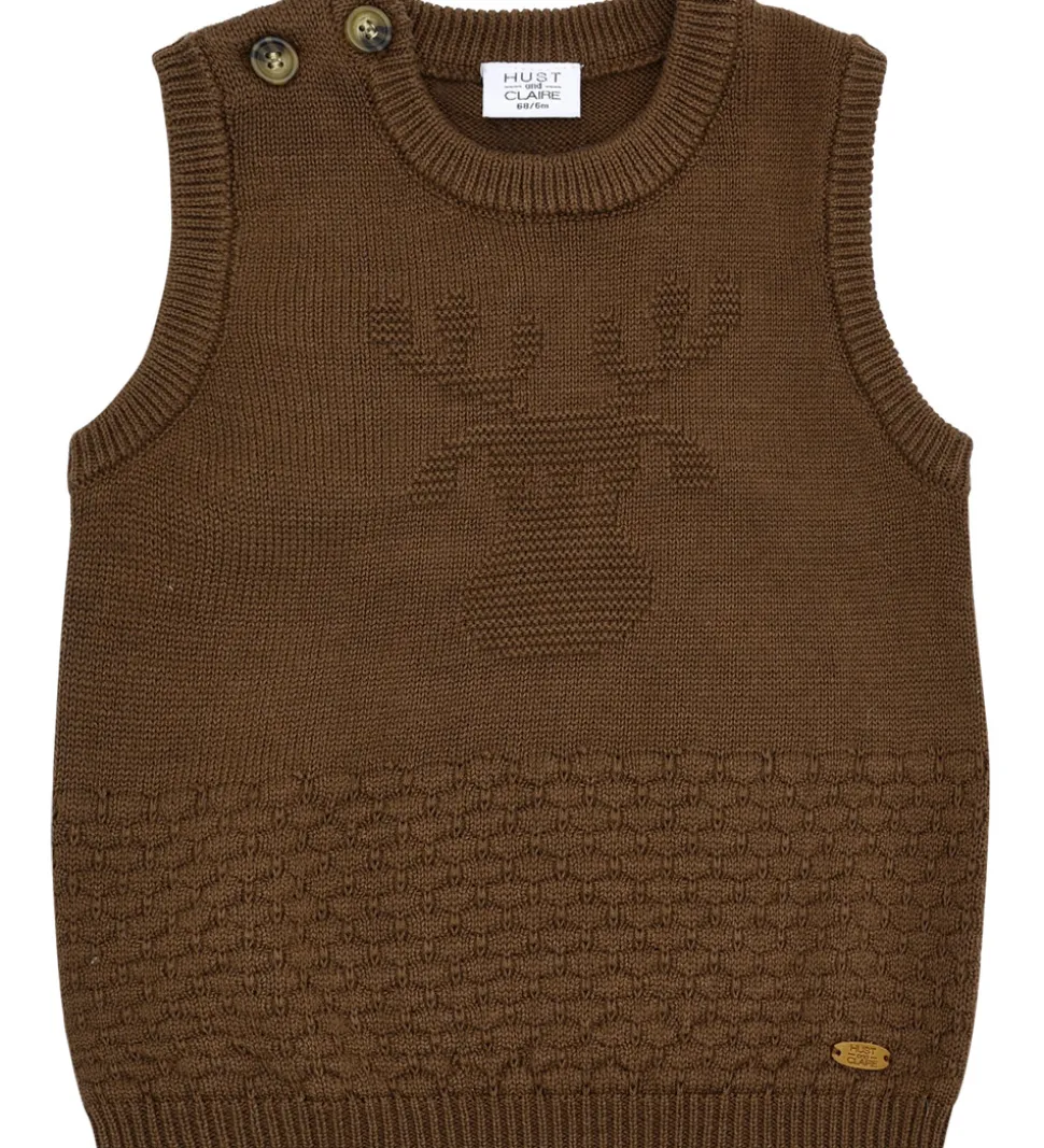 Flot Hust and Claire vest i en dyb brun nuance. Hust and Claire vesten prydes af et diskret mønster med et elghoved foran, og har fine knappedetaljer ved skulderen for nem påklædning.