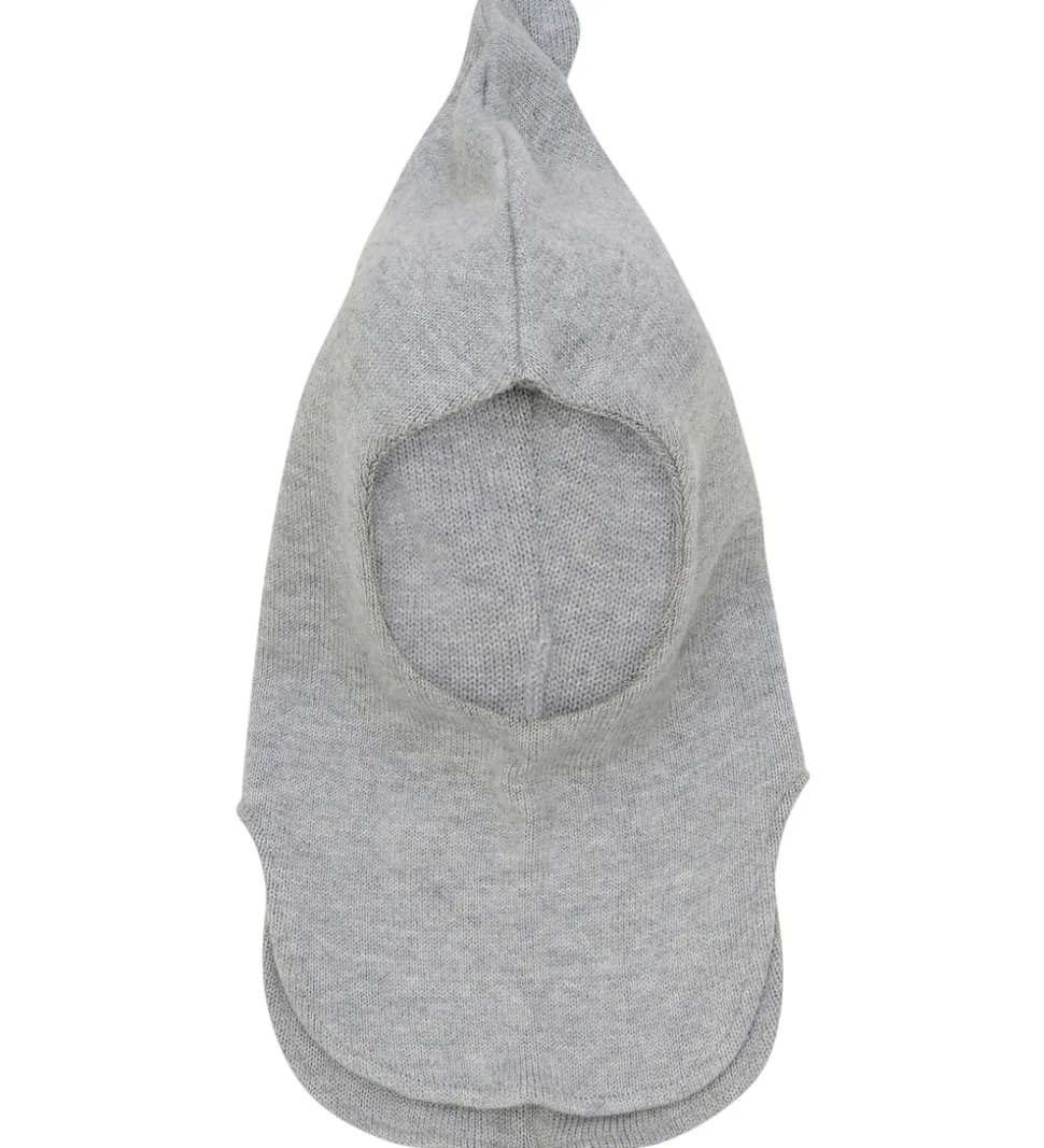 Elegant Huttelihut elefanthue strikket i en meleret lysegrå. Huttelihut elefanthuen består af to lag og har en spids hovedform, samt en split-effekt i bunden. Elefanthuen er fremstillet i en lækker blanding af merinould og bomuld.