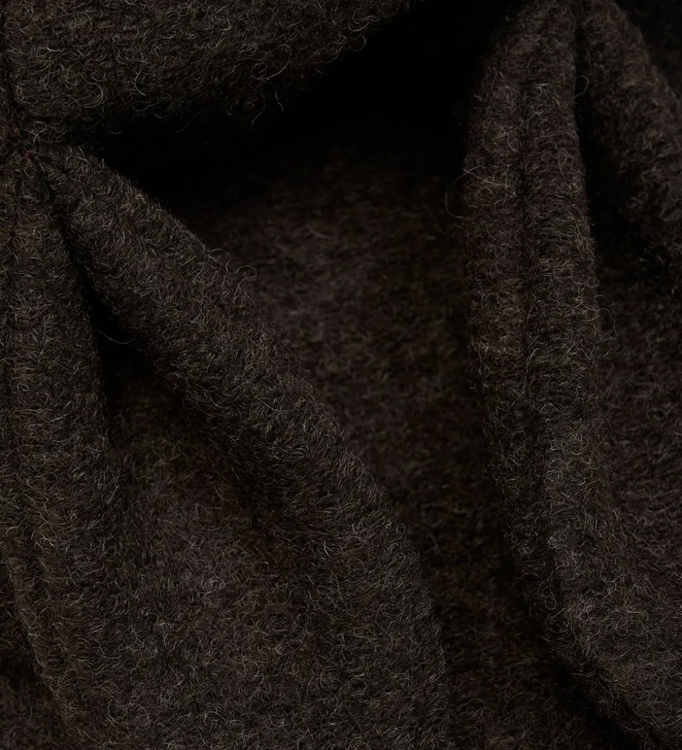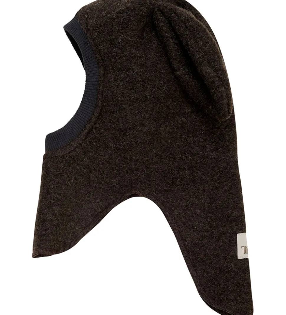 Praktisk Huttelihut elefanthue i en meleret, mørkebrun nuance af lunt uldfleece. Elefanthuen fra Huttelihut består af to lag og har en rund hovedform med lange kaninører. Elefanthuen har ribkant ved ansigtet der sikrer en god pasform.