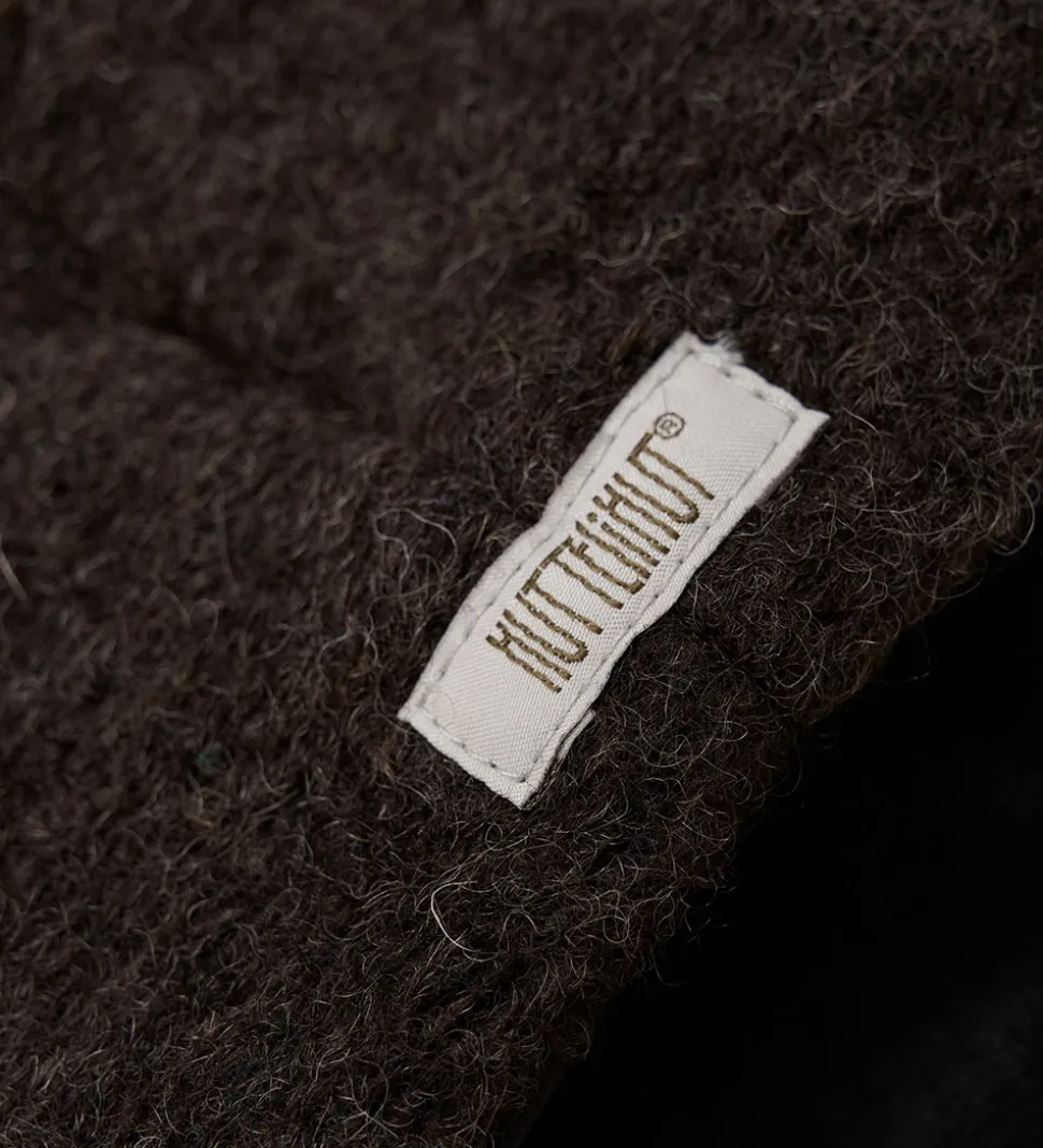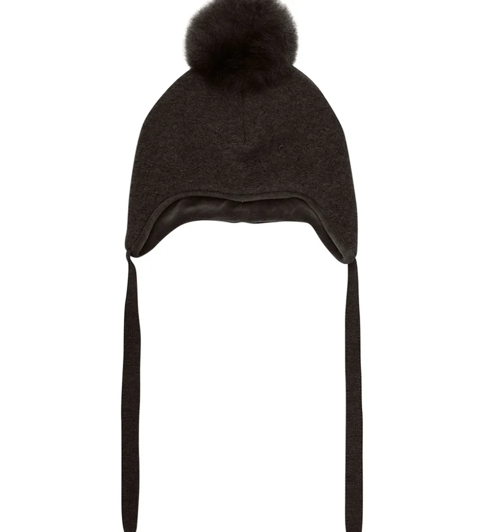 Elegant Huttelihut hue i en meleret, mørkebrun farve med en blød kvast af alpakkapels på toppen. Huen har en rund hovedform og er med praktiske bindebånd under hagen, som sikrer, at den sidder godt fast.
