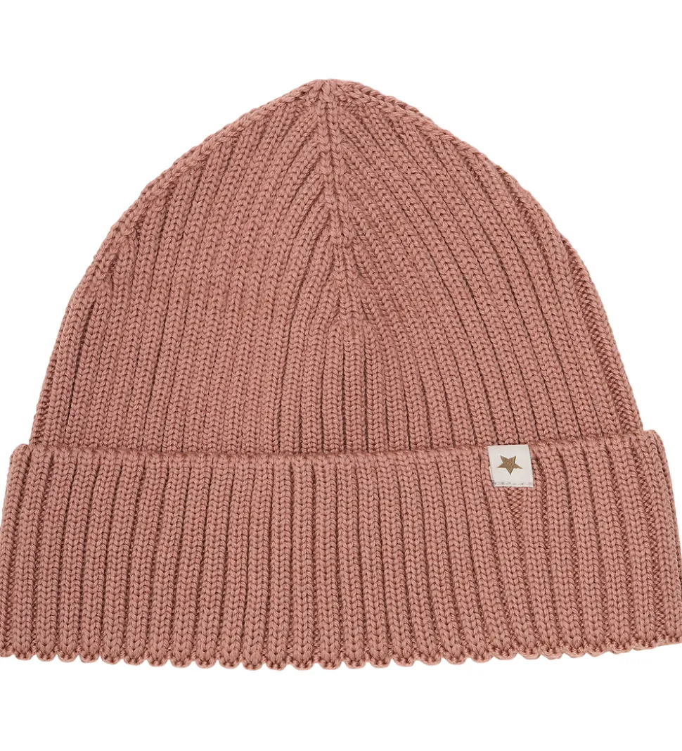 Charmerende Huttelihut hue strikket i en dæmpet, rosa nuance. Huen har en tydelig ribstruktur, der giver et klassisk udtryk. Det brede ombuk fremhæver ribdetaljerne på en fin måde. En lille firkantet stofmærke med en stjerne dekorerer fronten.