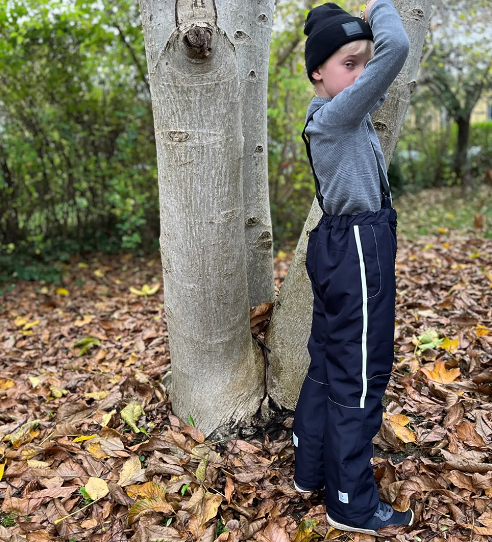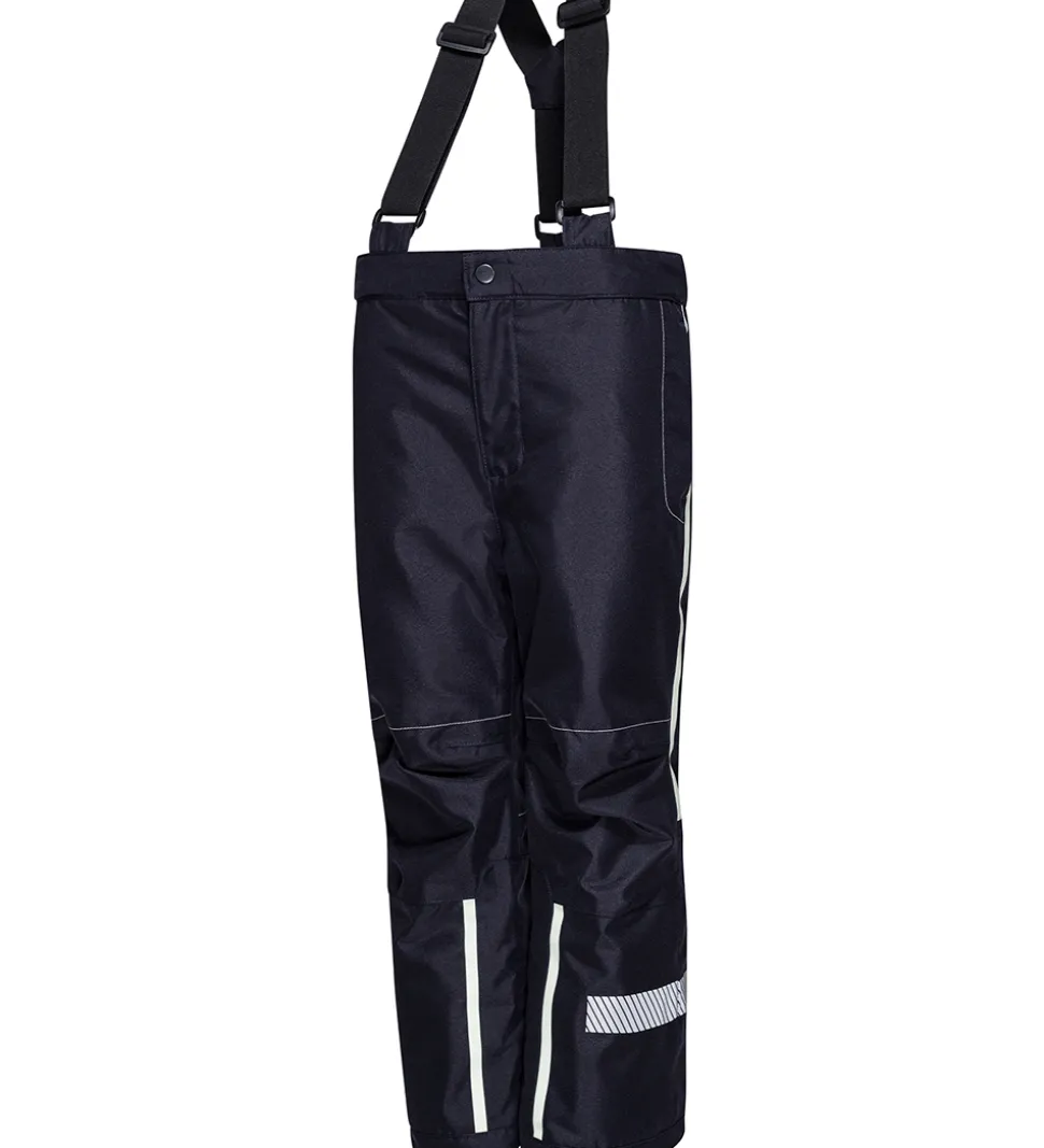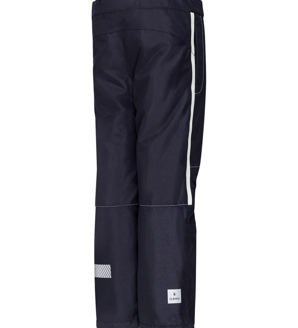 Praktiske ILDHU skibukser i navyblå med mange reflekser for høj synlighed i trafikken.