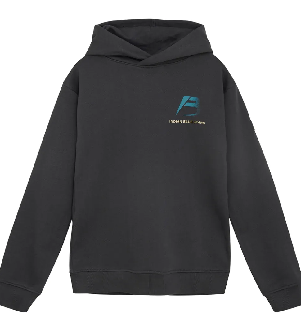 Smart Indian Blue Jeans hættetrøje i koksgråt sweat, og på ryggen er der et stort tekstprint i blå og beige nuancer. Indian Blue Jeans hættetrøjen har en fast hætte medet bomuldsfor, og den har lange ærmer og brede ribkanter.
