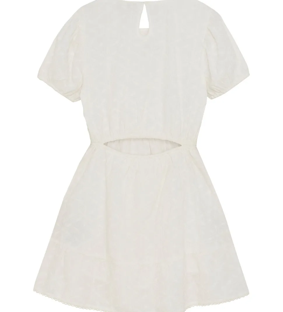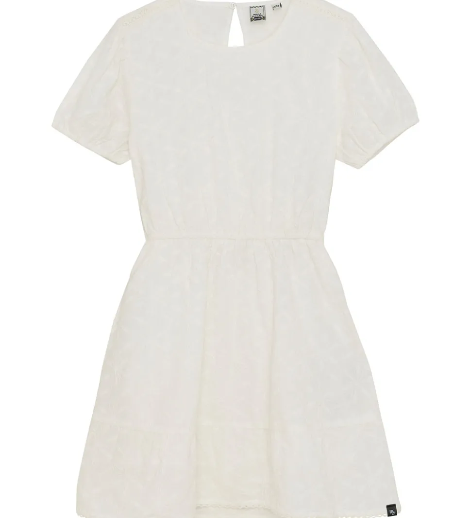 Skøn Indian Blue Jeans kjole i hvid med korte ærmer og et fint, broderet mønster. Kjolen har en feminin pasform, hvilket gør den til et alsidigt valg til forskellige anledninger. Kjolen er lavet i en let, fastvævet kvalitet, og den består af to lag, så den ikke fremstår gennemsigtig.