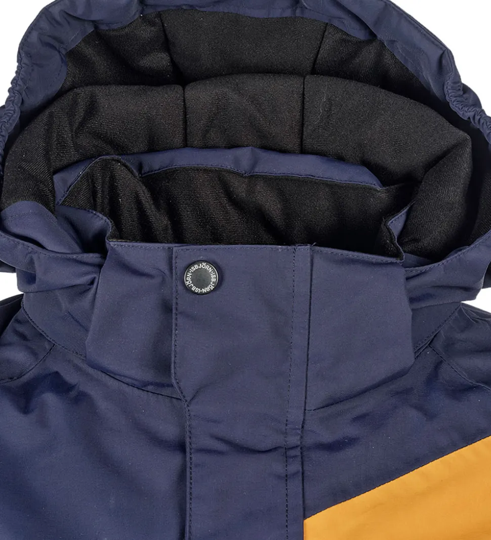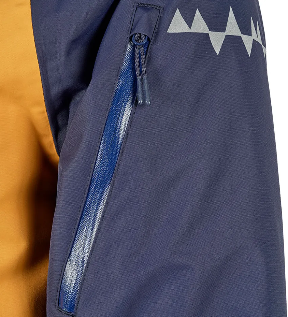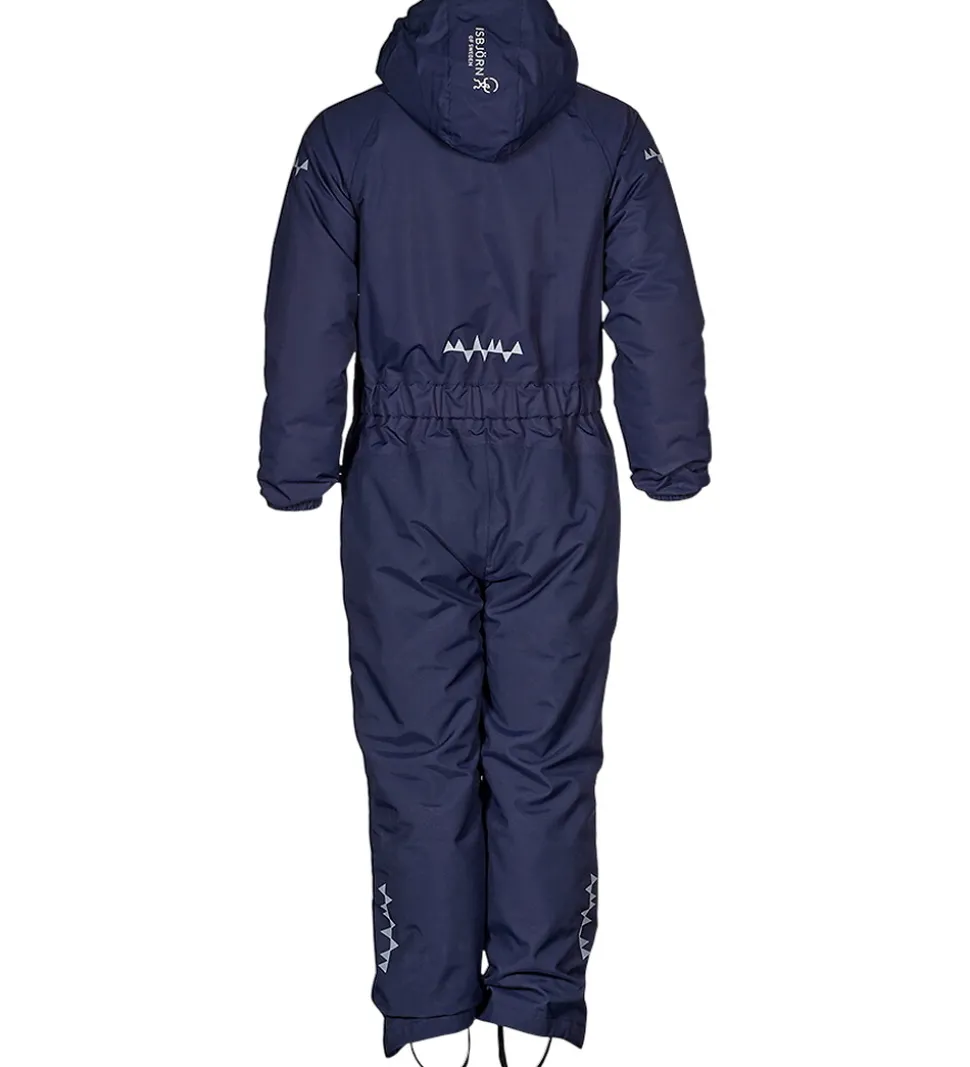 Fin Isbjörn Of Sweden flyverdragt navyblå med orange indsatser, der efterlader et ternet udtryk. Flyverdragten har hvide logoprint på venstre bryst og hætten samt smarte refleksprint på lænden, begge skuldre og ankler.