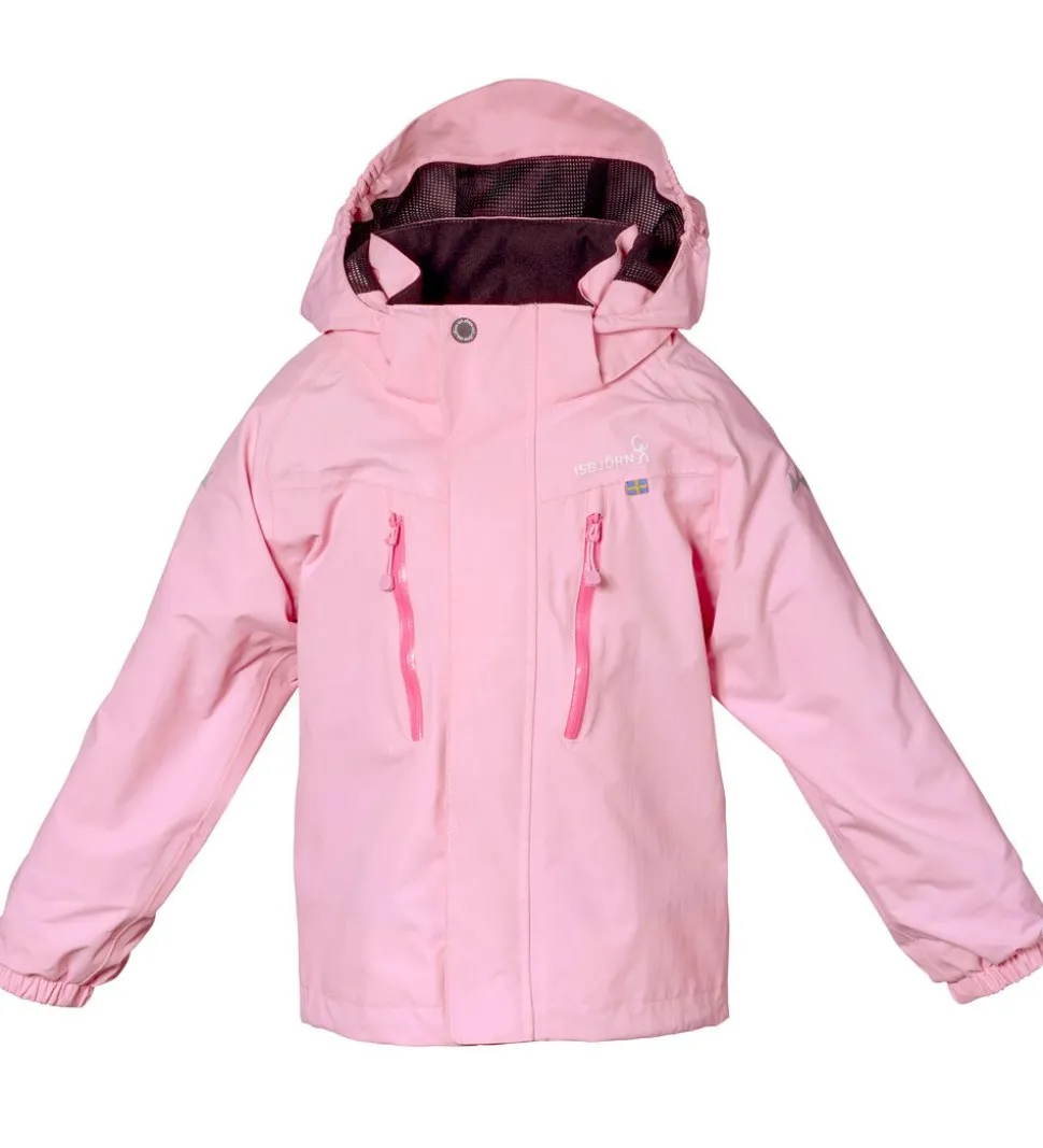 Lækker Isbjörn Of Sweden skaljakke i rosa. Skaljakken har hvide logoprint på venstre bryst og hætten samt smarte refleksprint på lænden og begge skuldre.