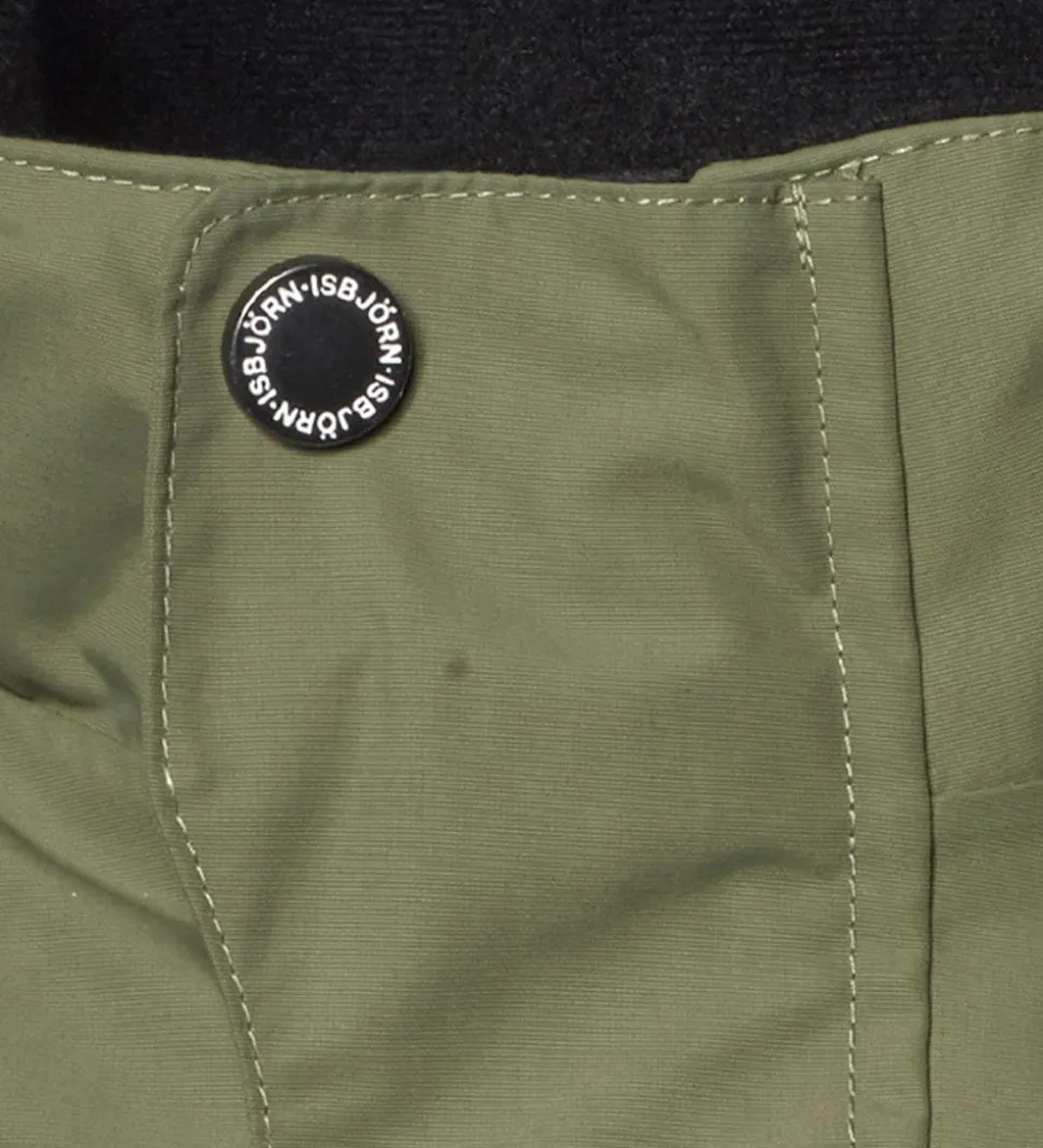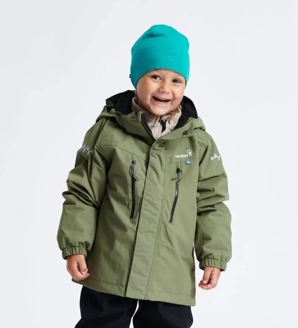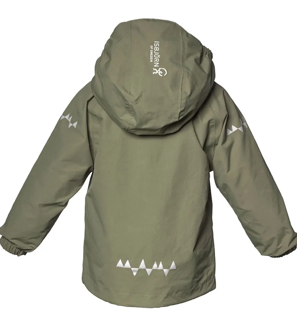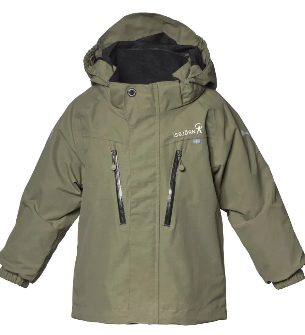 Lækker Isbjörn Of Sweden skaljakke i armygrøn med sorte lynlåse. Skaljakken har hvide logoprint på venstre bryst og hætten samt smarte refleksprint på lænden og begge skuldre.