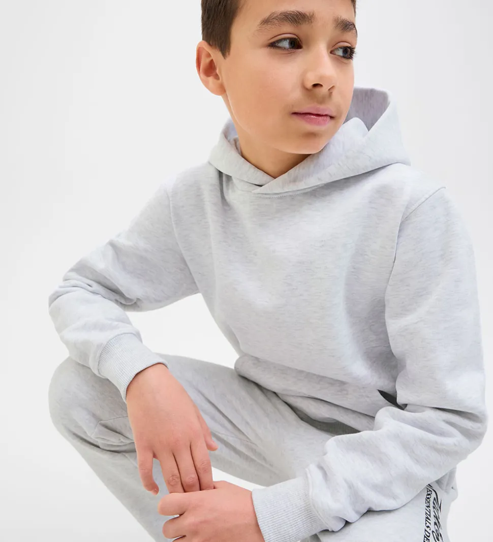 Flot Jack & Jones hættetrøje i gråmeleret. Jack & Jones hættetrøjen er lavet i en kraftig kvalitet med en blød hætte og lange ærmer. Den har brede ribkanter i ærme- og taljeåbning. Indvendigt er der blødt, børstet bomuld.