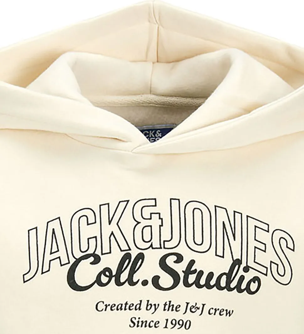 Elegant hættetrøje fra Jack & Jones i en blød cremefarve med et tydeligt, sort logoprint på forsiden. Hættetrøjen har en klassisk pasform med ribkanter ved ærmerne og forneden, hvilket giver en struktureret afslutning.
