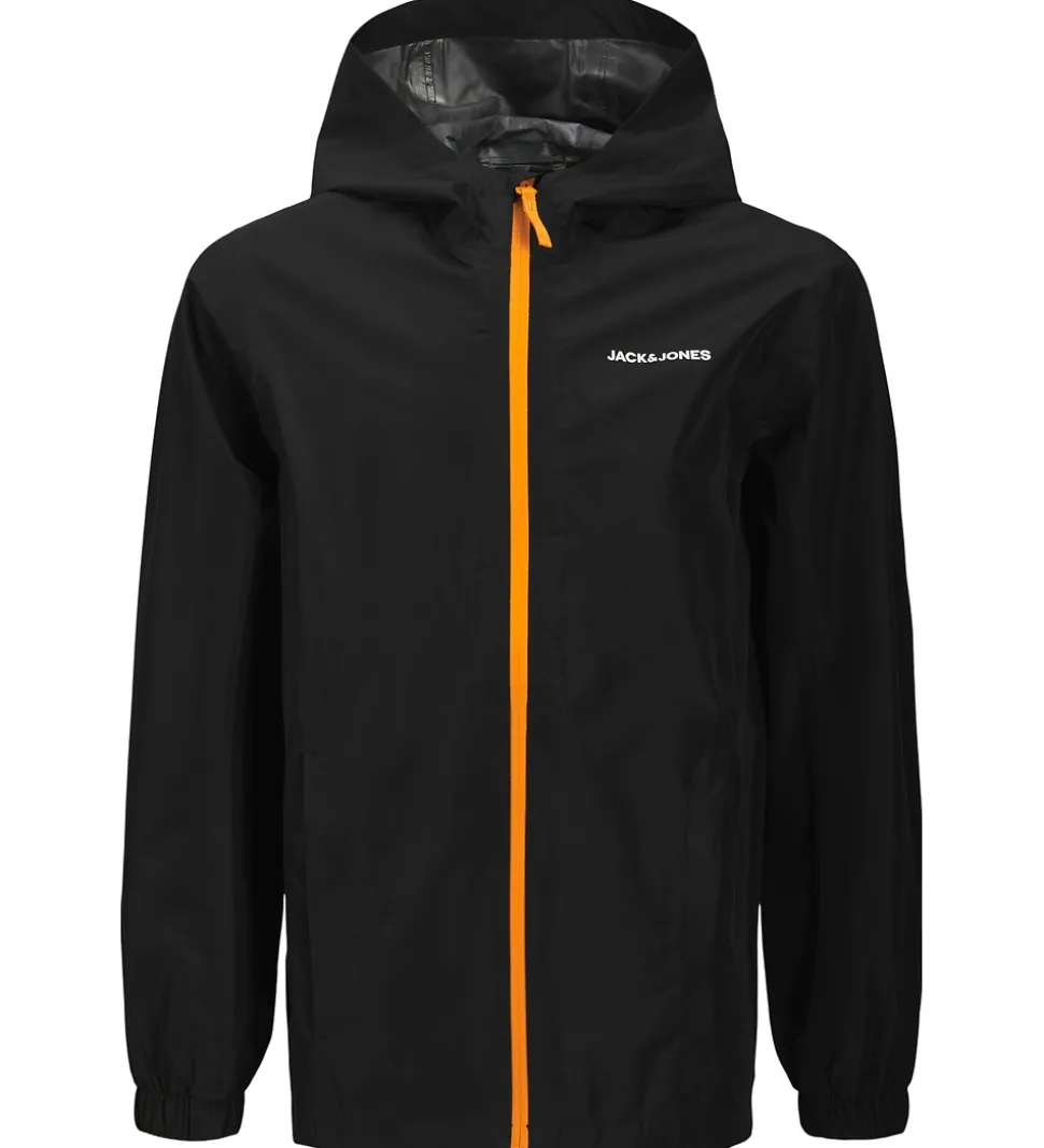 Smart Jack & Jones regnjakke i sort med en orange lynlås samt et hvidt logoprint på venstre bryst.