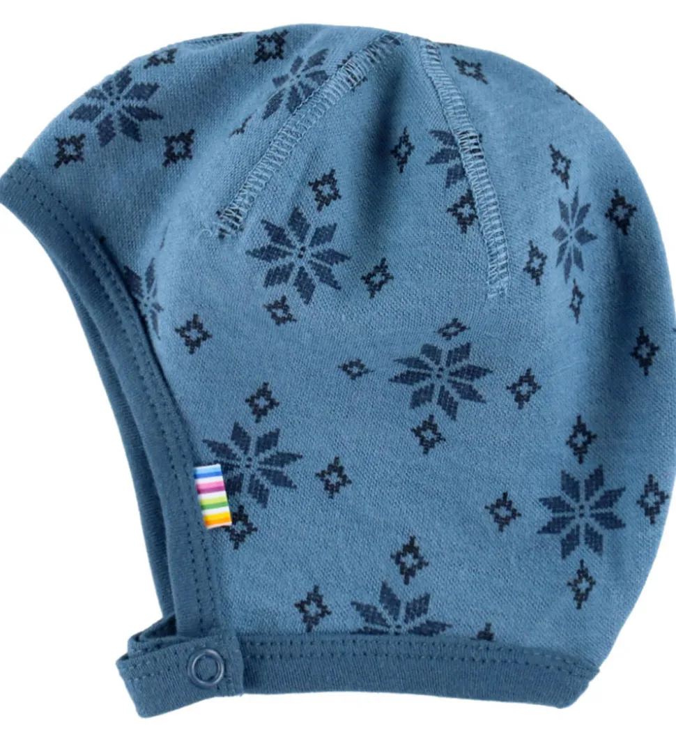 Praktisk Joha babyhjelm i en blå nuance med et elegant snefnugmønster. Joha babyhjelmen har en rund hovedform, som sikrer en god pasform, med en blød ribkant langs åbningen. Babyhjelmen lukkes nemt med en trykknap under hagen, som giver stabilitet og sikkerhed. Designet er både stilfuldt og funktionelt.