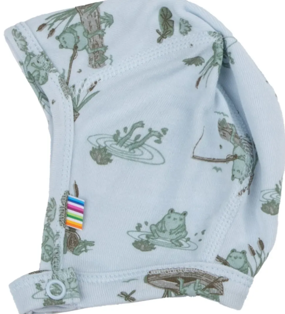 Lækker Joha babyhjelm i lyseblå med et print af fine frøer.