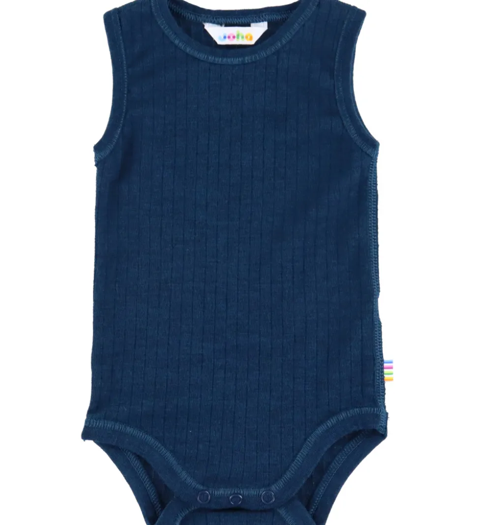Blød Joha body i en mørkeblå farve med en fin ribstruktur. Bodyen er ærmeløs og har en rund halsudskæring, hvilket giver et enkelt udtryk.
