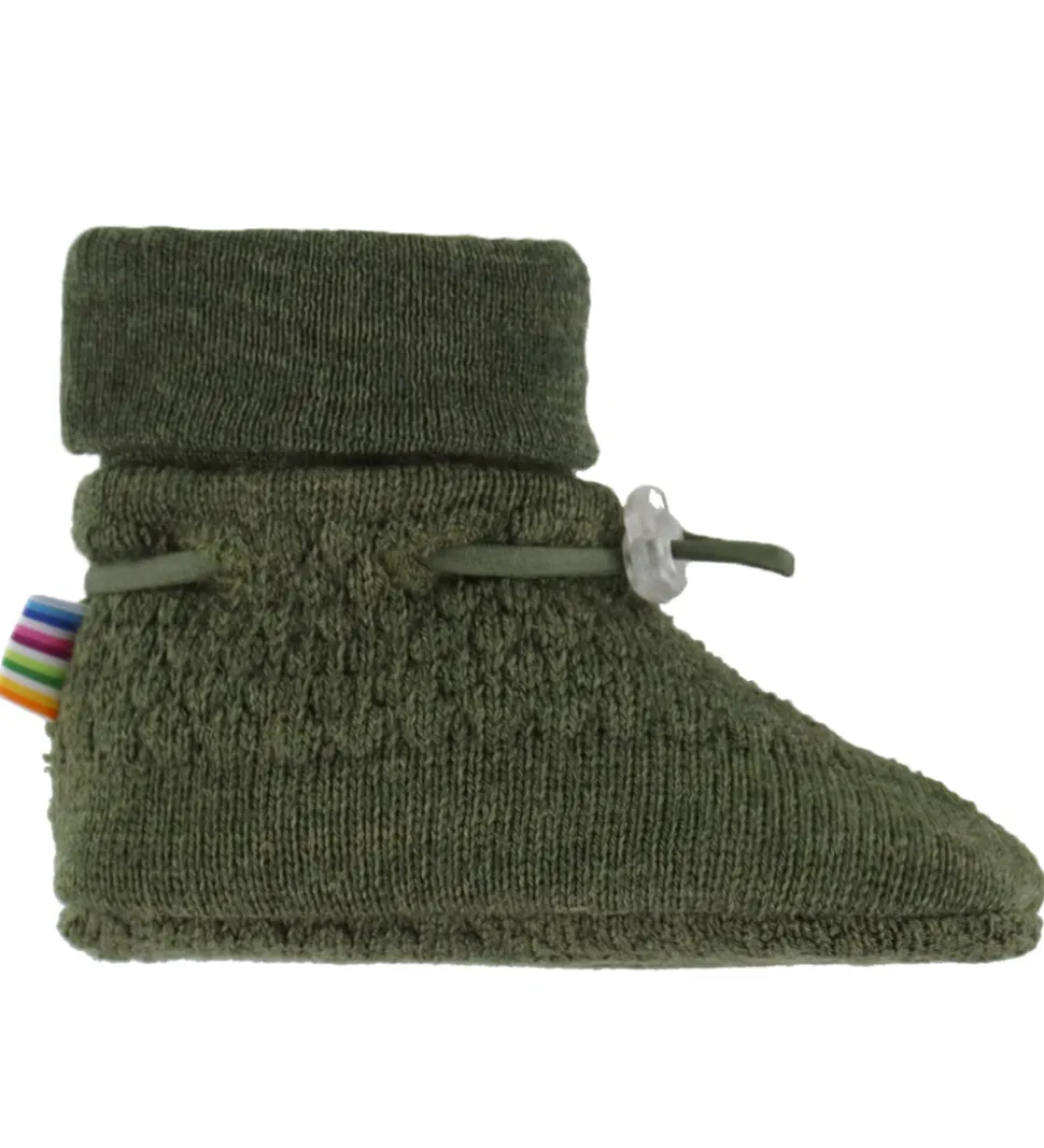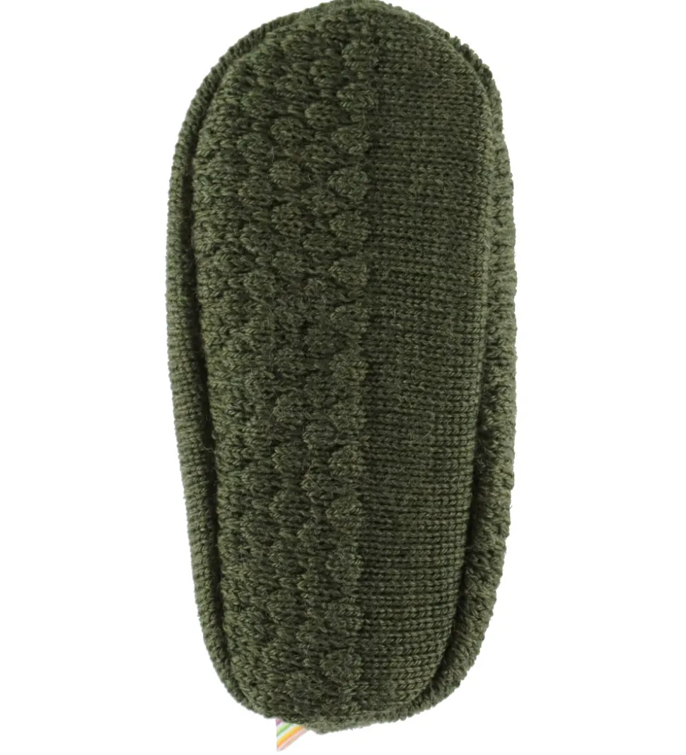 Dejlige Joha futter i mørkegrøn strik med stribet struktur. Joha futterne har ribkant øverst og en elastik omkring anklerne, som kan strammes med et spænde. De er fremstillet af merinould.