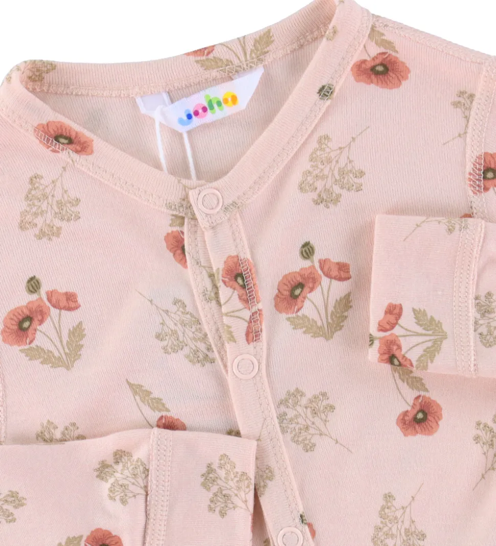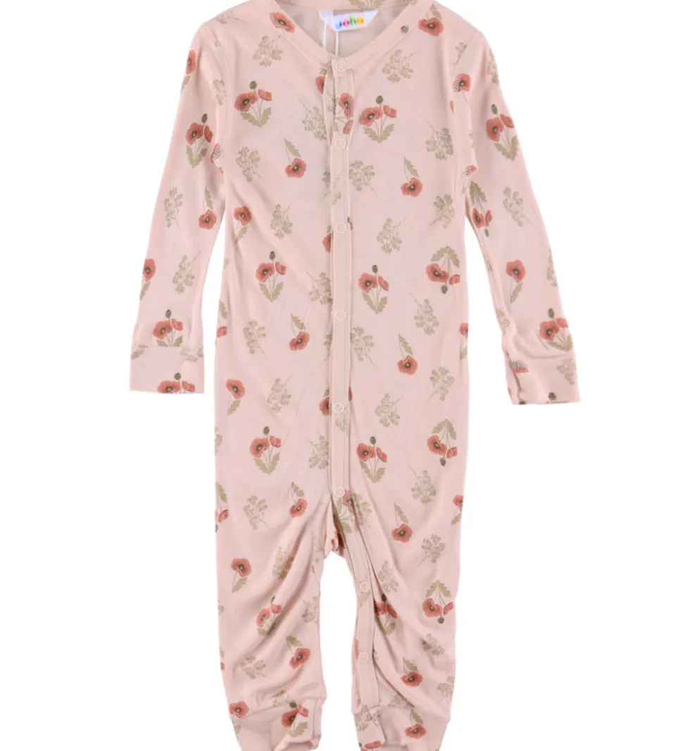 Skøn Joha heldragt i lys rosa prydet med et fint blomsterprint i mørk rosa og brune nuancer. Heldragten har en rund halsudskæring med trykknapper fra halsen til venstre ankel. Heldragten har lange ærmer og lange ben, og er fremstillet i en blød kvalitet.