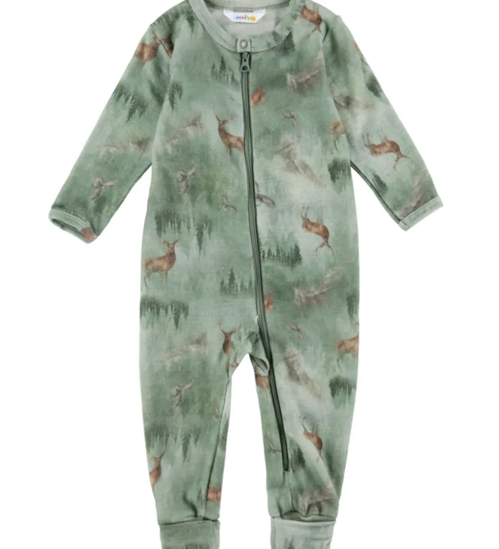 Charmerende Joha heldragt i grøn med et flot print af hjorte og skovlandskab.