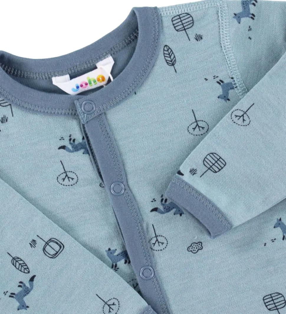 Skøn Joha heldragt i mint turkis, med støvet blå kanter og print af ræve og træer i støvet blå og sorte nuancer.