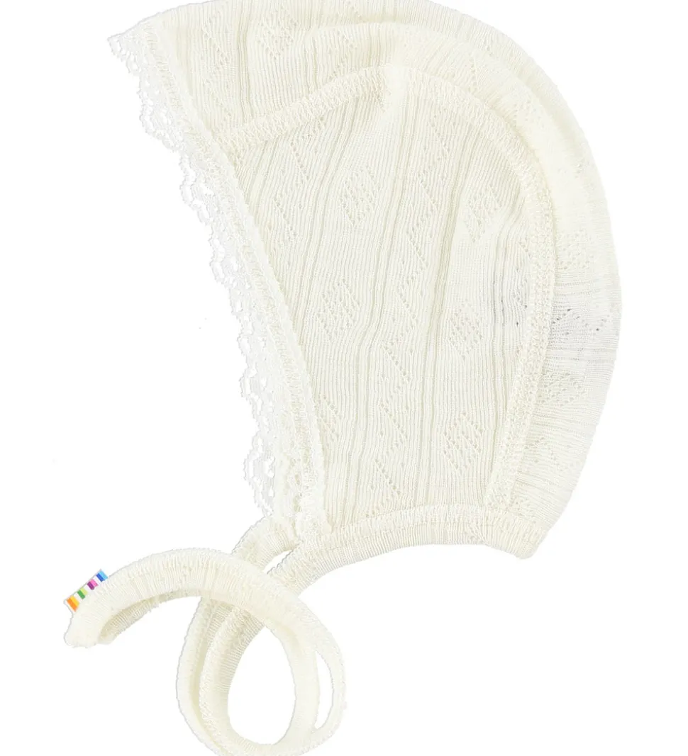 Hjelmen har en sød blondekant og lukkes med bindebånd.