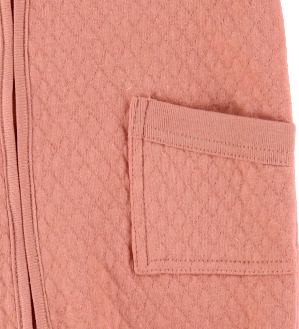 Flot Joha køredragt i en lækker laksefarve med markante åbne lommer på forsiden. Dragten har en smuk quiltet struktur, hvilket giver et elegant og stilrent udtryk.