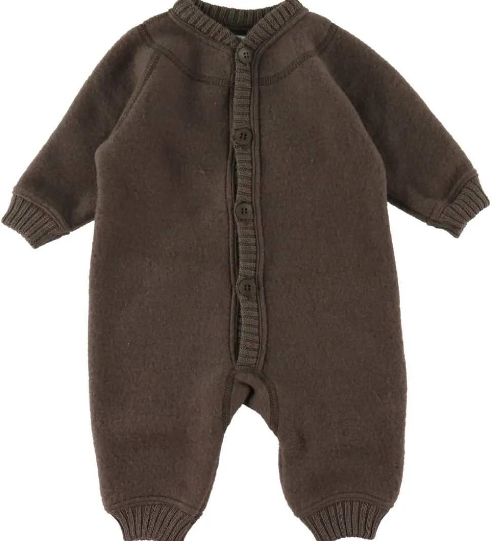 Joha køredragten har lange ærmer og ben, og i alle åbninger er der smalle ribkanter. Fortil kan dragten åbnes med praktiske knapper. Køredragten er lavet af en kraftig, filtet uldkvalitet, der føles rigtig blød og behagelig mod huden. Ulden sørger for, at barnet altid har den helt rigtige temperatur.