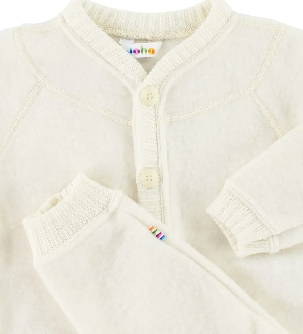 Joha køredragten er lavet af en kraftig, filtet uldkvalitet, der føles rigtig blød og behagelig mod huden. Ulden sørger for, at barnet altid har den helt rigtige temperatur.