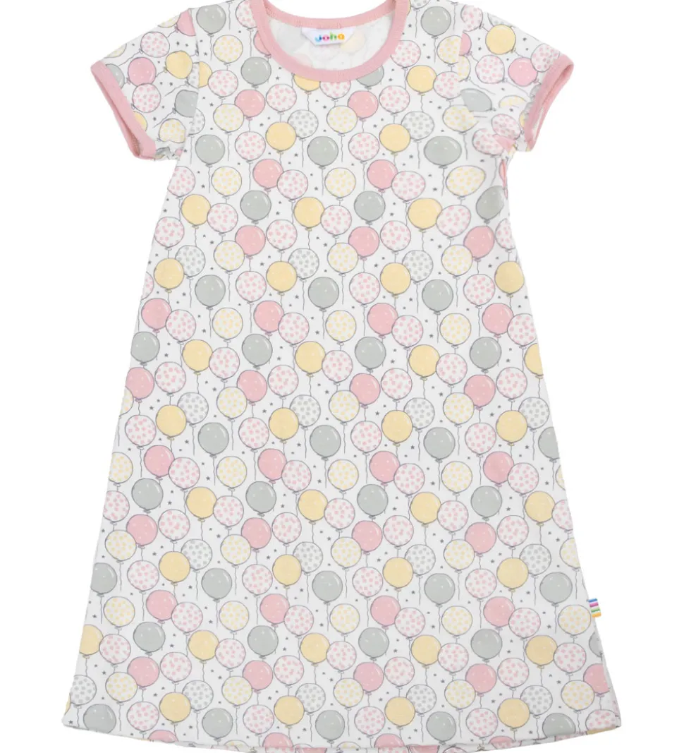 Farverig Joha natkjole i hvid med et sjovt ballonprint i rosa, gul og grøn med få rosa glimmer prikker, der giver et legende udtryk. Natkjolen er perfekt til afslapning før sengetid.