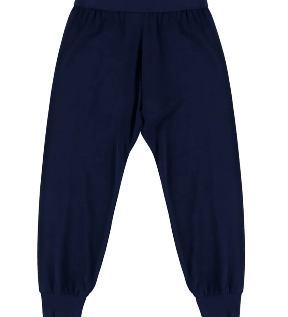 Skønt Joha nattøj bestående af en natbluse og et par natbukser. Natblusen er hvid med racerprint i blå nuancer. Den har en rund halsudskæring og lange ærmer med brede ribkanter. Natbukserne er ensfarvet navyblå med elastik i taljen og ribkanter ved anklerne. Nattøjet er fremstillet af blødt bambus viskose.