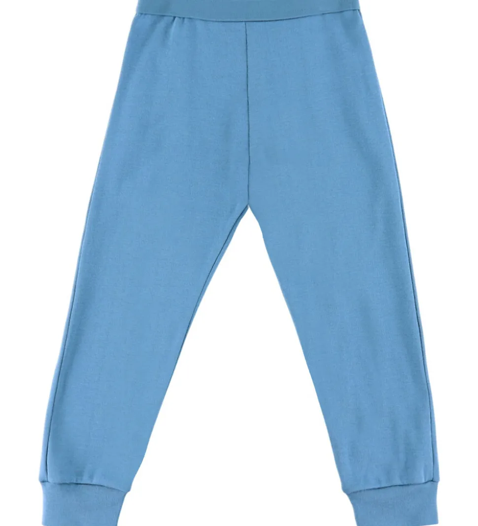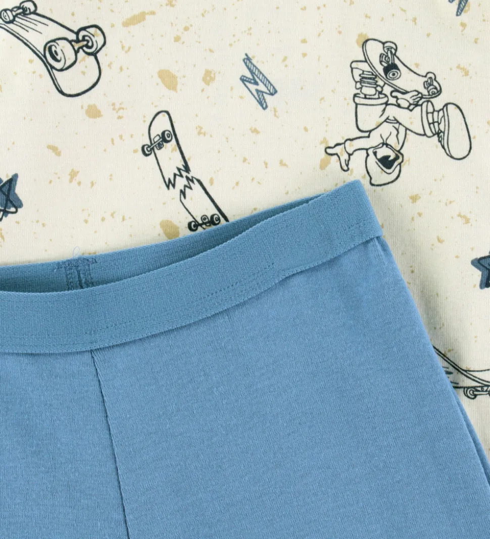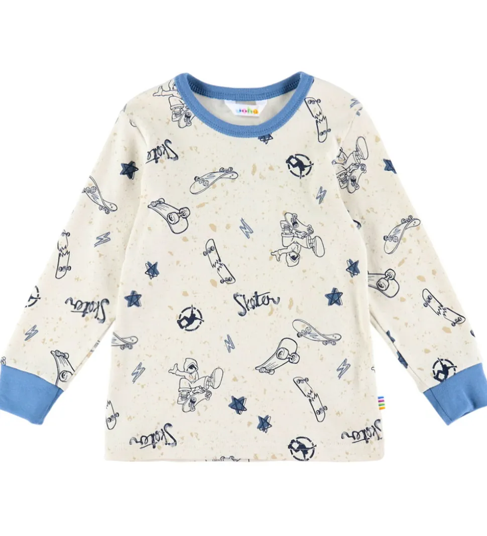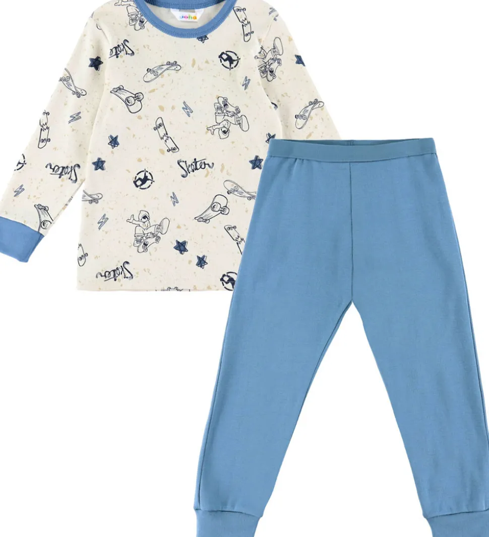 Skønt Joha nattøj bestående af en natbluse og et par natbukser. Natblusen er lys beige med blåt skaterprint. Den har en rund halsudskæring og lange ærmer med brede ribkanter. Natbukserne er ensfarvet blå med elastik i taljen og ribkanter ved anklerne.