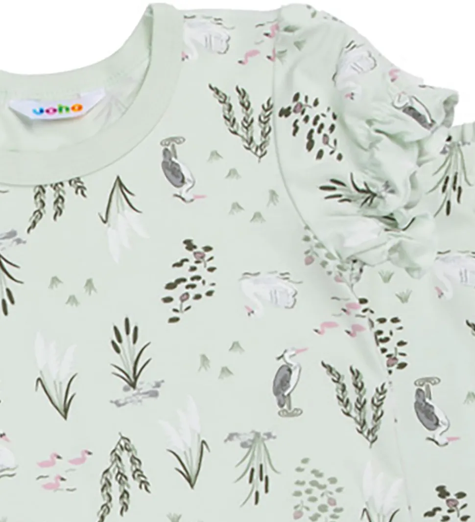 Sødt Joha nattøj bestående af en t-shirt og et par bukser. T-shirten og bukserne er i en lys grøn nuance, med print af dyr og planter.