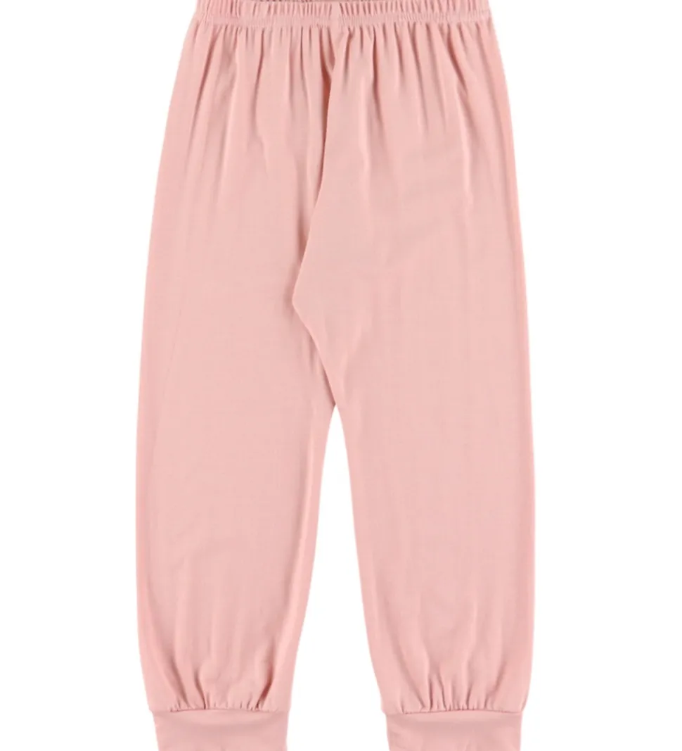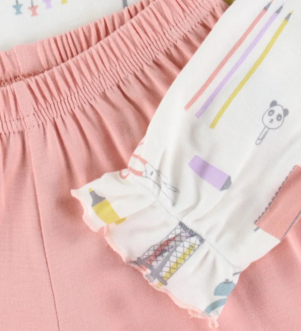 Dejligt Joha nattøj bestående af en natbluse og et par natbukser. Natblusen er er hvid med farverigt print af skoleartikler og en rosa kant i halsen. Den har elastikkanter ved ærmerne. Natbukserne har en god elastik i taljen og brede ribkanter ved anklerne. Nattøjet er fremstillet af bambus viskose.