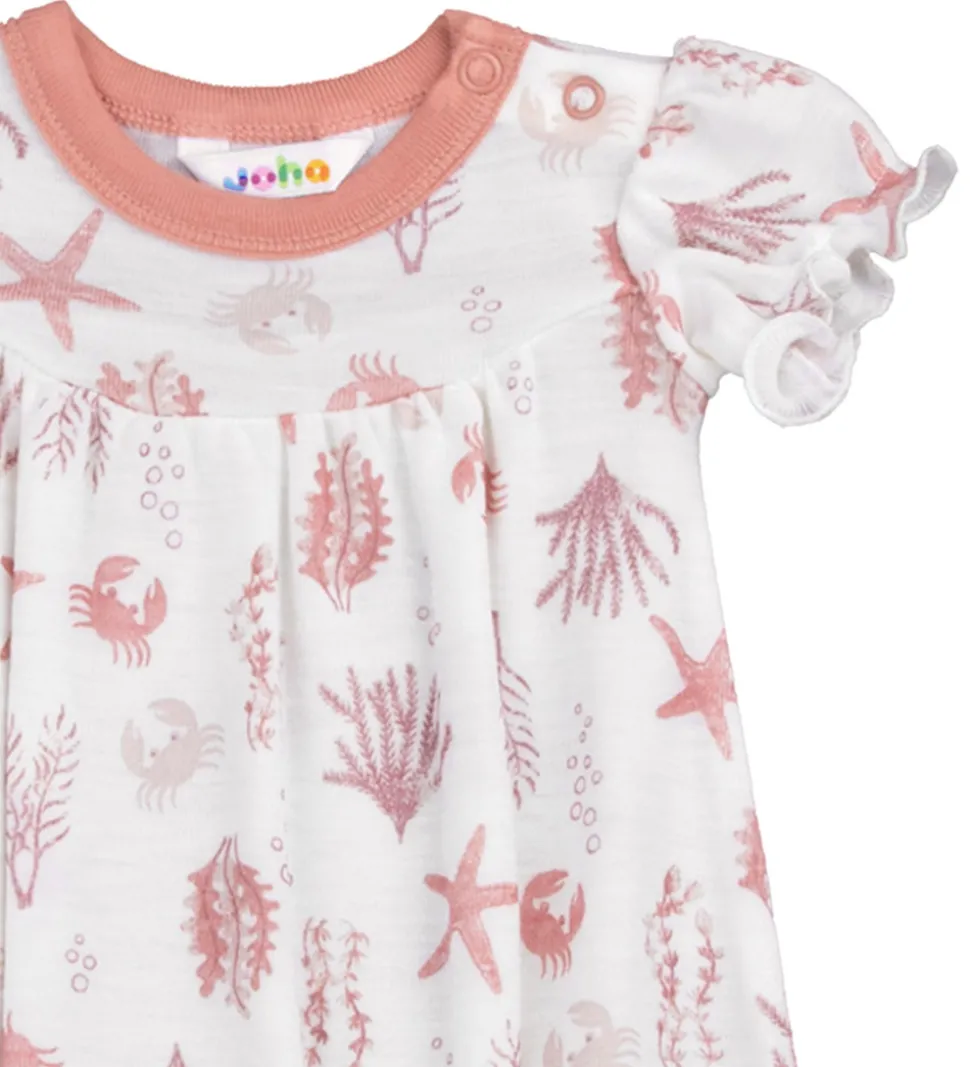 Lækker Joha sommerdragt i hvid med et fint havprint af krabber, søstjerner og tand i rosa nuancer. Det bløde design sikrer komfort til de mindste i det varme vejr.