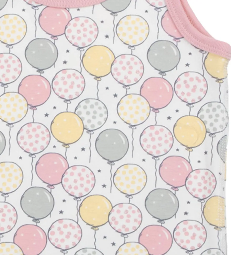 Fin Joha undertrøje i hvid, prydet med farverige ballonprint i rosa, gul og støvet grøn med glimmertråd på nogle af prikkerne i de lyserøde balloner. Undertrøjen har en behagelig pasform og er ideel til enhver dagligdags situation.