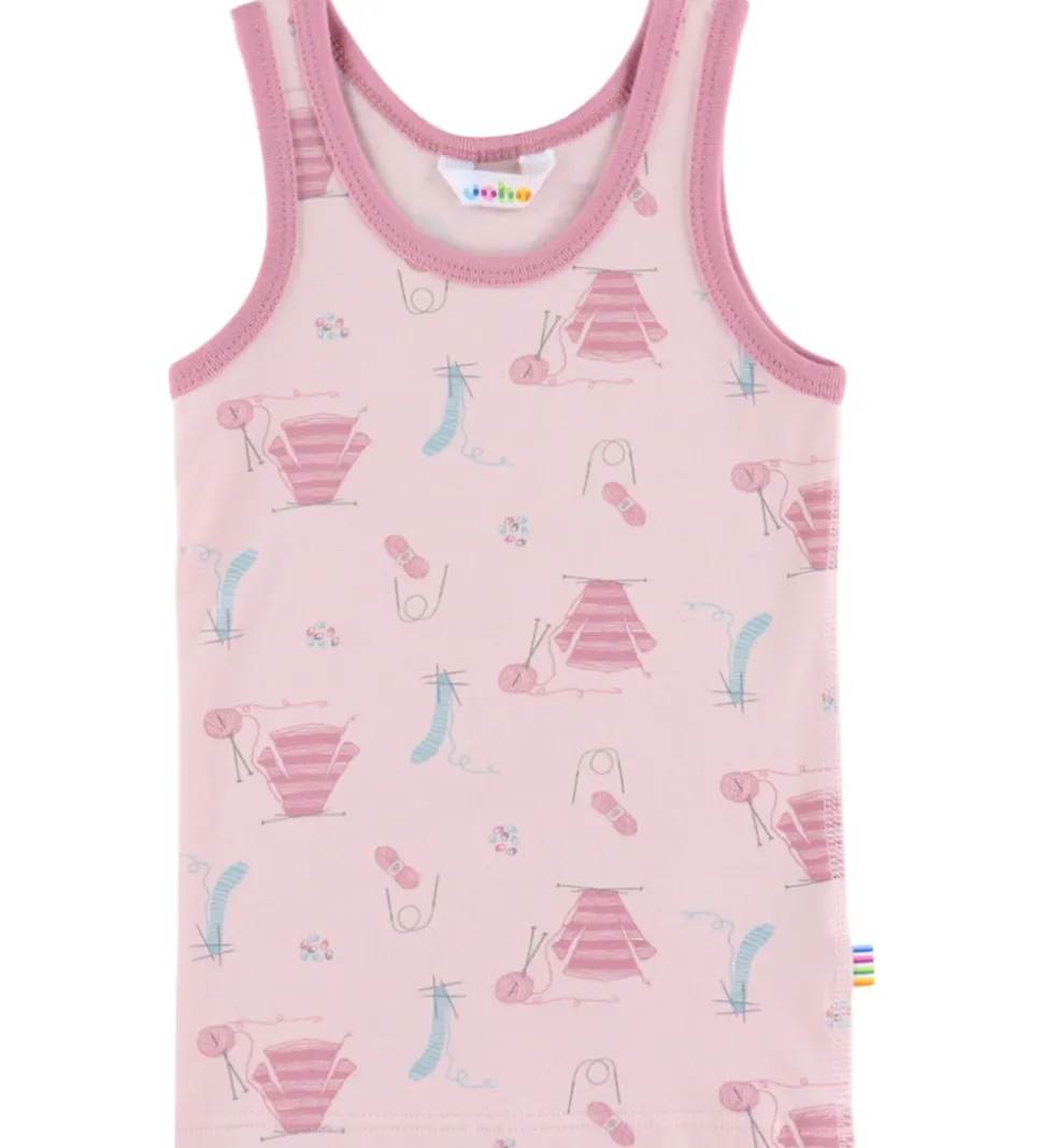 Sød Joha undertrøje i rosa med print med strikketema og mørkere kanter i hals- og ærmeåbninger. Undertrøjen har brede skulderstropper og en rund halsudskæring.