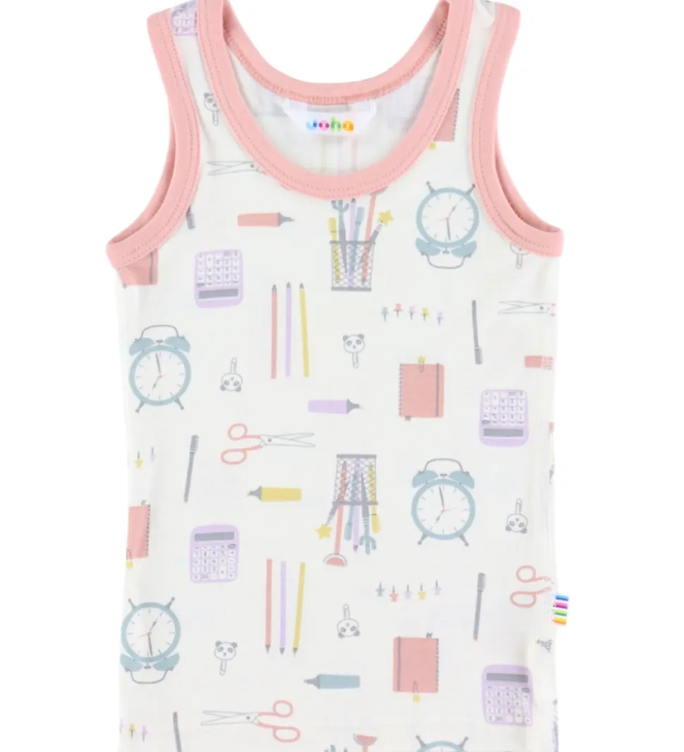 Flot Joha undertrøje i hvid med print af skole-motiver i forskellige farver. Undertrøjen har brede skulderstropper og en rund halsudskæring. Den er fremstillet af bambus viskose og lycra.