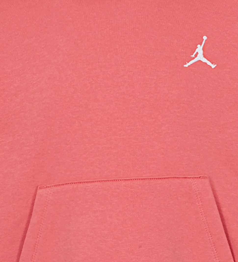 Lækker Jordan hættetrøje i en pink nuance med et hvidt broderet logo på venstre bryst. Denne hættetrøje har en praktisk kængurulomme og en behagelig hætte, perfekt til både afslapning og leg. På indersiden er der blødt, børstet bomuld.