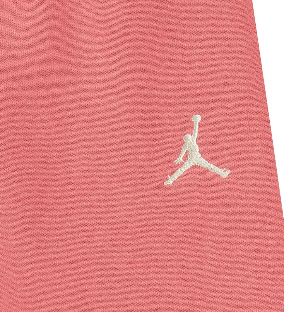 Blødt Jordan sweatsæt, der består af en hættetrøje og et par sweatpants. Hættetrøjen er pink med flotte blokfarver i lys rosa og råhvid. Sweatpantsene er ensfarvet pink, og begge dele har et hvidt broderet logo i venstre side.