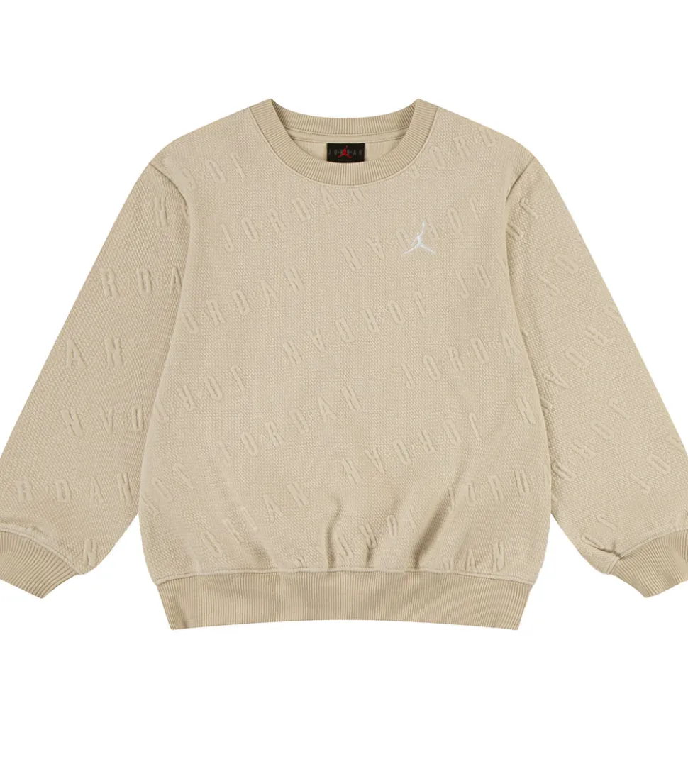 Elegant Jordan sweatsæt, der bestå af en sweatshirt og et par sweatpants i en ensfarvet beige nuance, der har et indvævet mønster med navn Jordan over det hele. Der er et diskret hvidt logo på både sweatshirten og sweatpantsene.