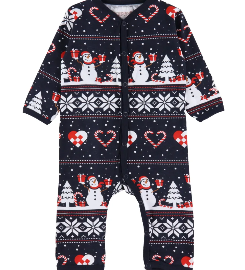 Skøn Jule-Sweater Heldragt i en mørkeblå nuance med et farverigt juleprint, hvor søde snemænd og julestjerner pryder fronten. Jule-Sweater har lange ærmer og knaplukning ned langs fronten for nem påklædning.