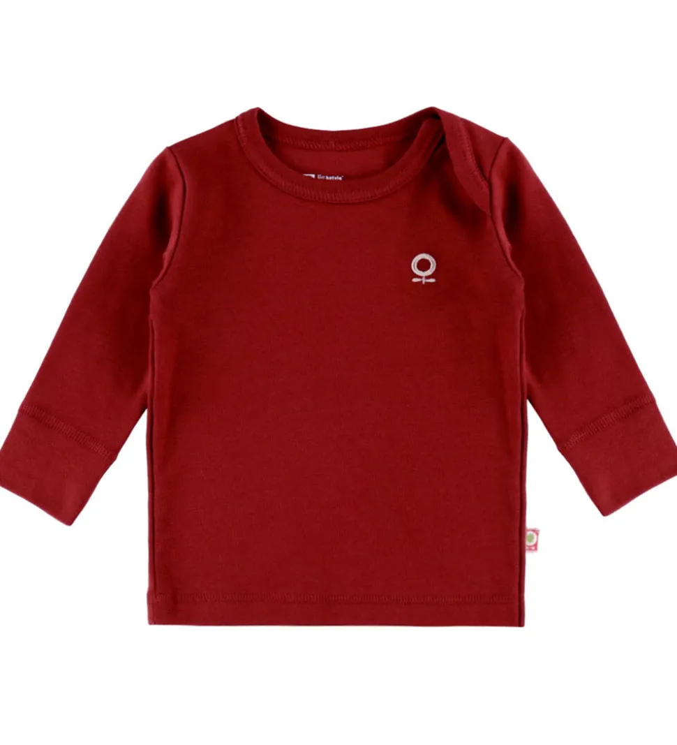 Skøn Katvig bluse i rød med et lille, hvidt logo broderet i hvid på venstre bryst. Blusen har en rund halsudskæring med en foldeskulder i den ene side og lange ærmer med brede ribkanter.