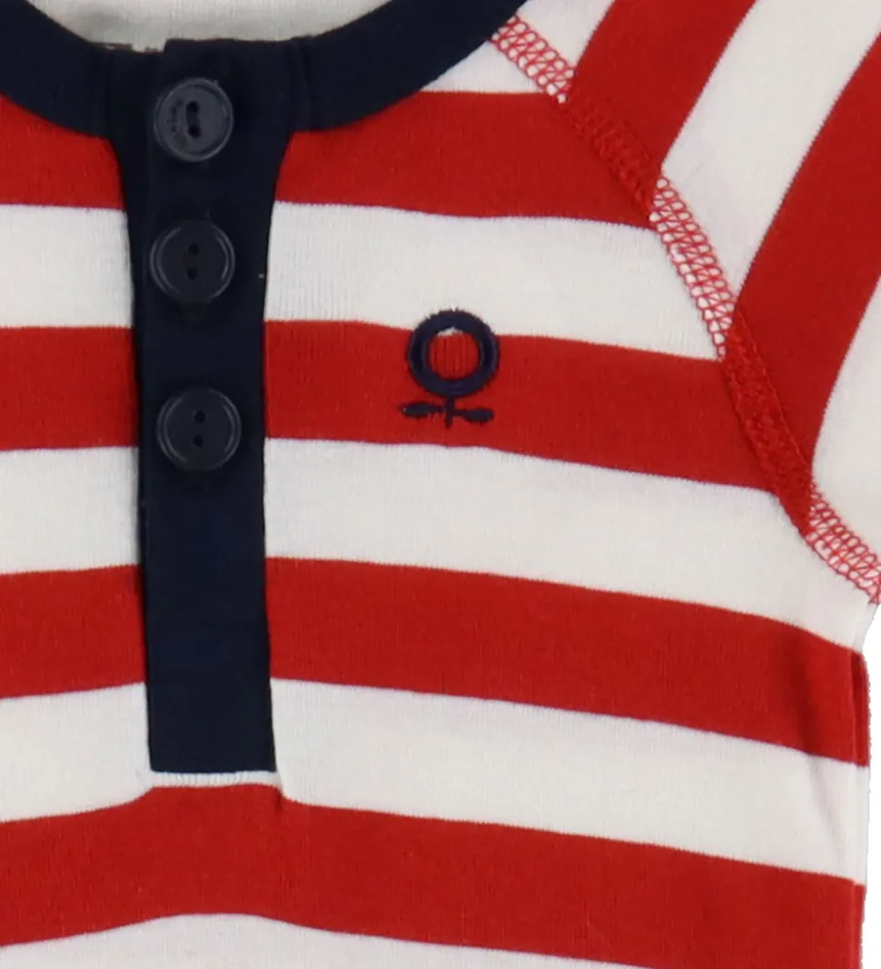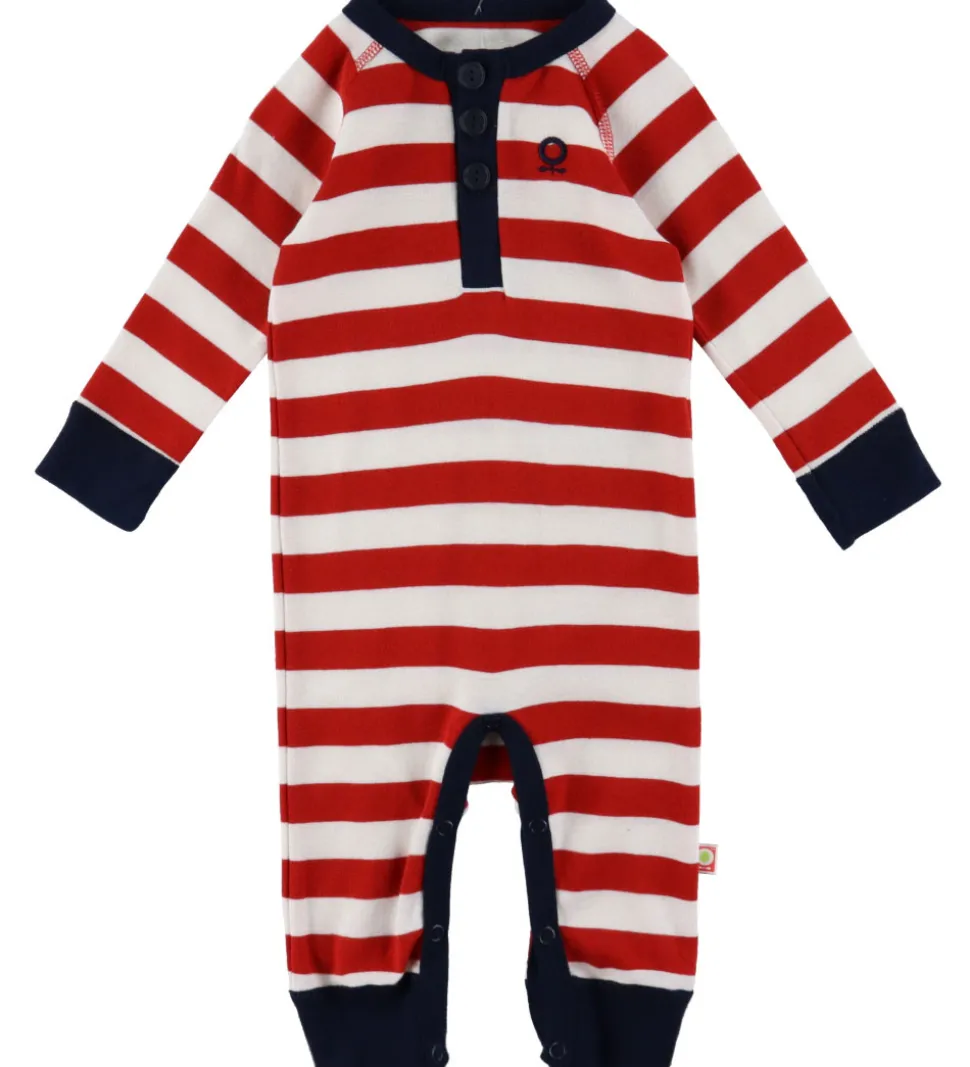 Heldragten har knaplukning øverst og et lille logo på brystet, hvilket tilføjer et charmerende touch til designet. Mellem benene kan heldragten åbnes helt op ved hjælp af trykknapper.