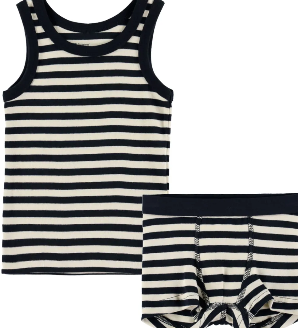 Flot Katvig undertøj bestående af en undertrøje og et par boxershorts i stribet navyblå og hvid. Undertrøjen har brede skulderstropper og en rund halsudskæring. Boxershortsene har en god elastik i livet, som sikrer en god pasform.