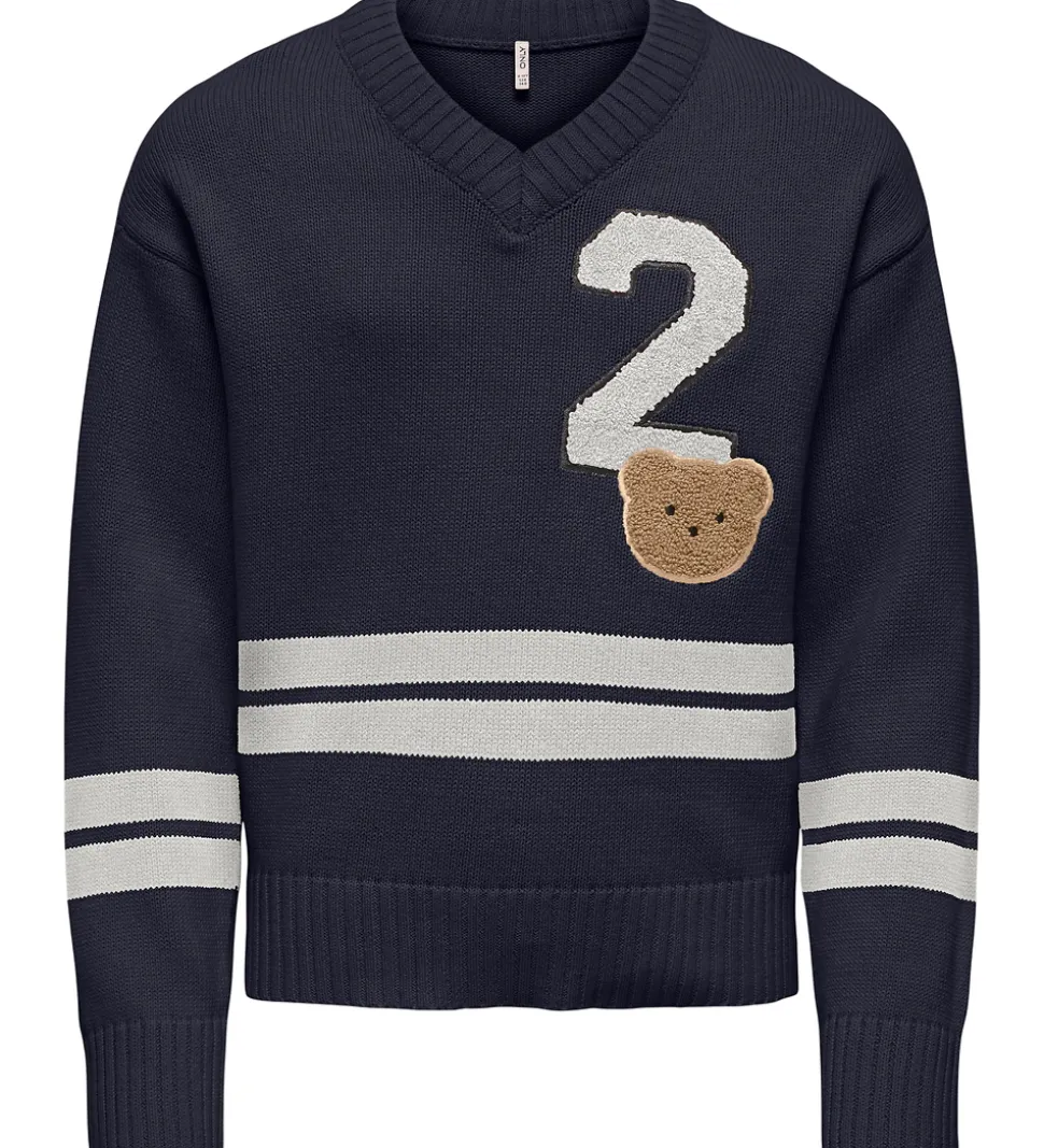 Smart Kids Only bluse i navyblå strik med to hvide striber og en applikation af et bjørnehoved og et 2-tal i hvidt frotté. Blusen har lange ærmer og en klassisk V-hals, der giver et stilrent udtryk. Blusen har ribkanter langs alle åbninger.