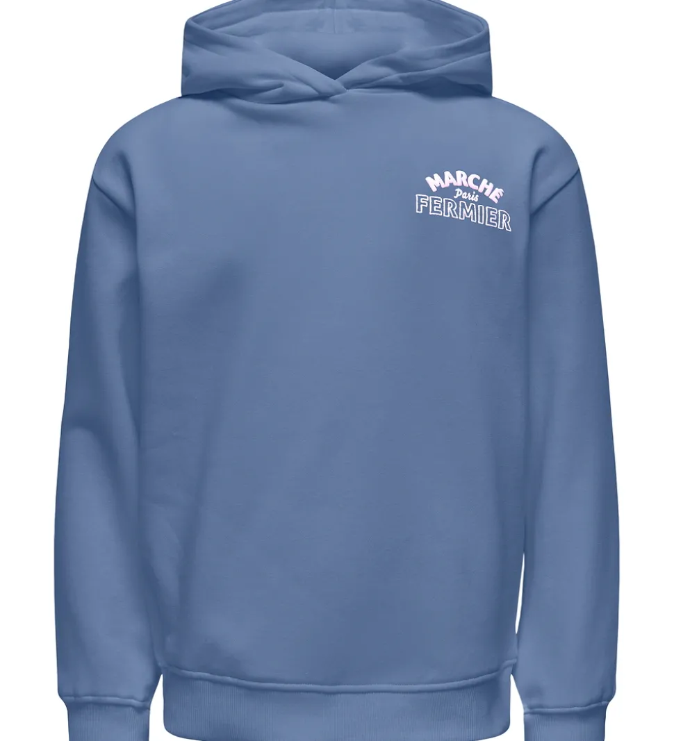 Skøn Kids Only hættetrøje i en flot, blågrå nuance og med blød, børstet bomuld indvendigt. Hættetrøjen fra Kids Only har et gummiprint på brystet med teksten “Marché Paris Fermier” i rosa. På ryggen er der et stort tekstprint i samme stil.