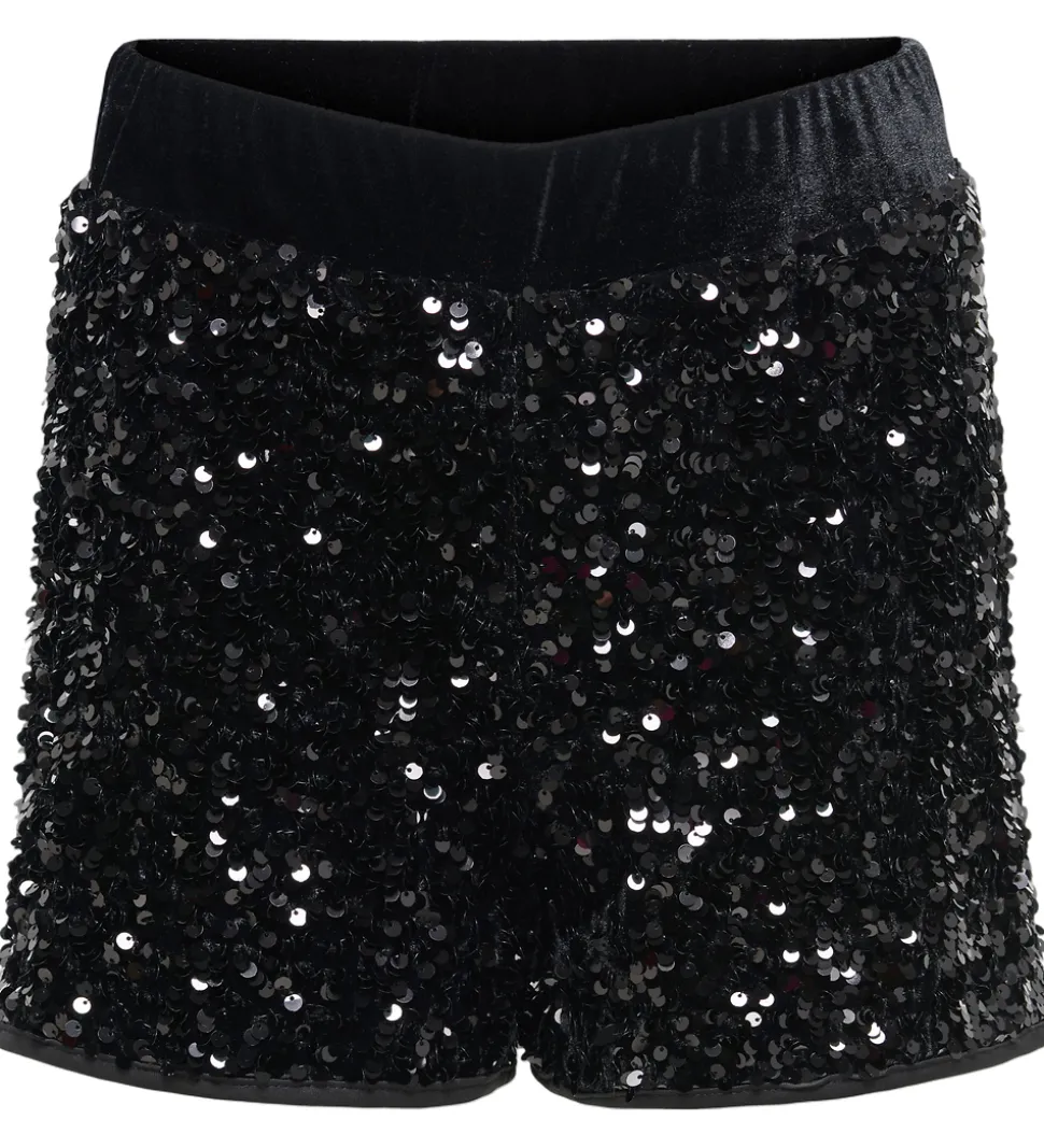 Glitrende Kids Only shorts i sort velour dekoreret med et lag af pailletter, der giver et unikt udtryk. Kids Only shortsene har en elastisk talje, der sikrer en god pasform.