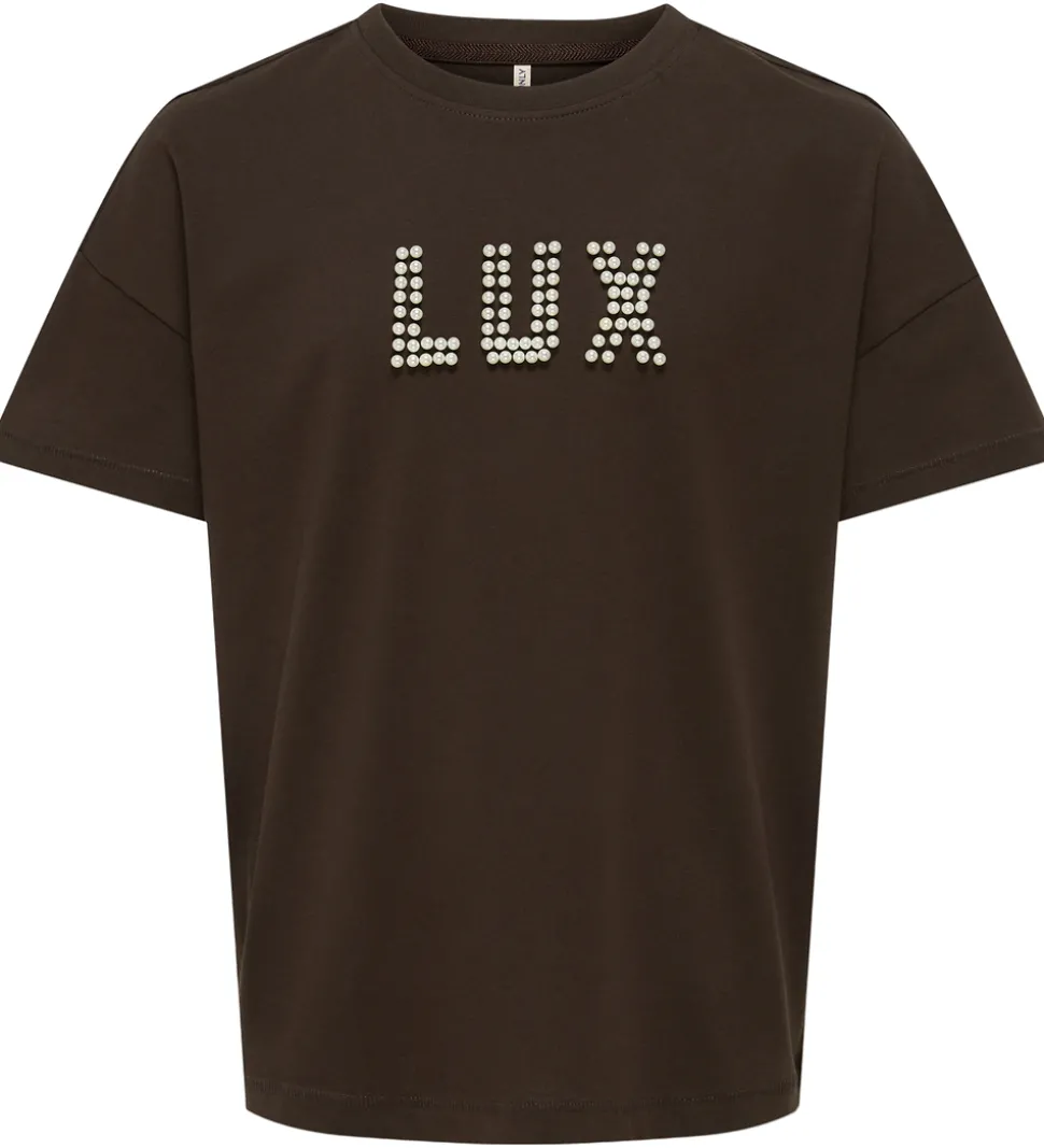 Elegant Kids Only t-shirt i mørkebrun. T-shirten har små, hvide perler på fronten som danner ordet “LUX”. Kids Only t-shirten har en klassisk rund halsudskæring og korte ærmer, som giver et tidløst look.