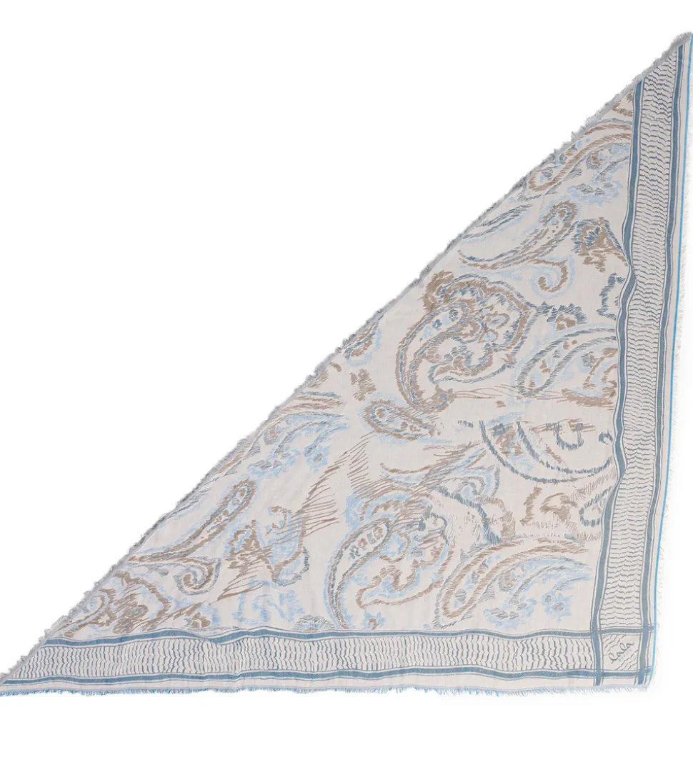 Lala Berlin tørklædet har en firkantet form med frynser langs kanten, og det er lavet i en let, fastvævet kvalitet.