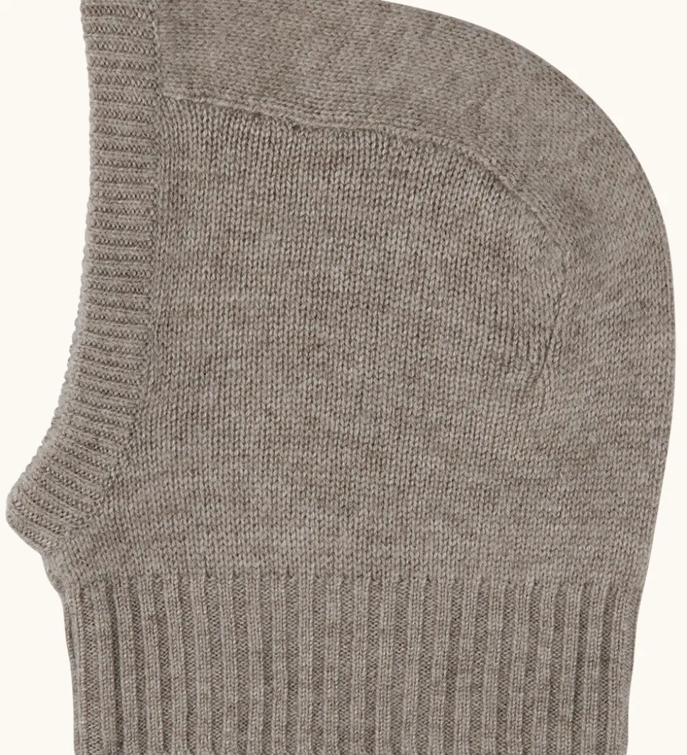 Fin Lalaby elefanthue i ensfarvet brun. Lalaby elefanthuen har en rund hovedform og en bred ribkant i bunden. Denne eleafanthue er håndstrikket i Nepal, og den er lavet af eksklusivt kashmir.