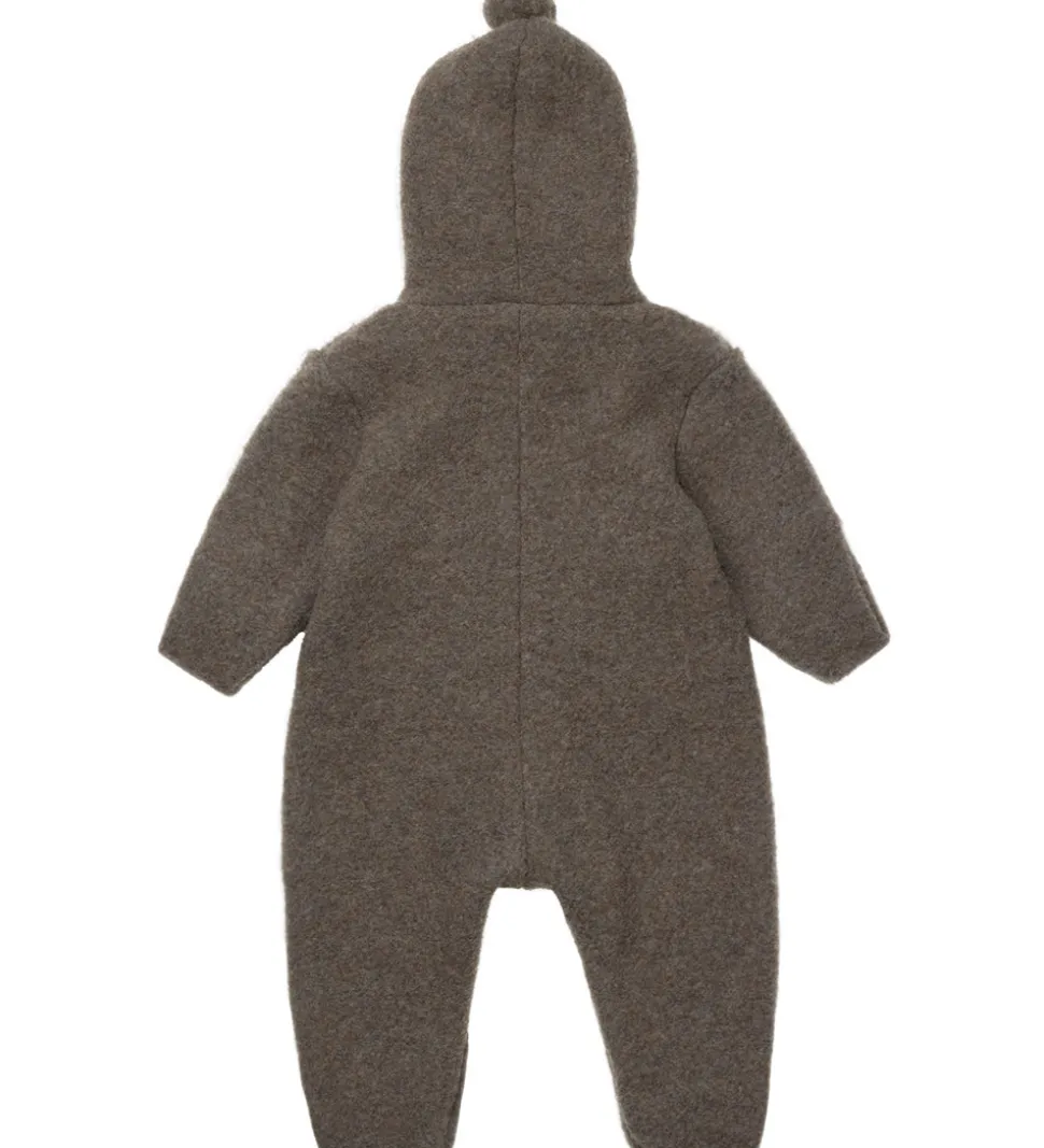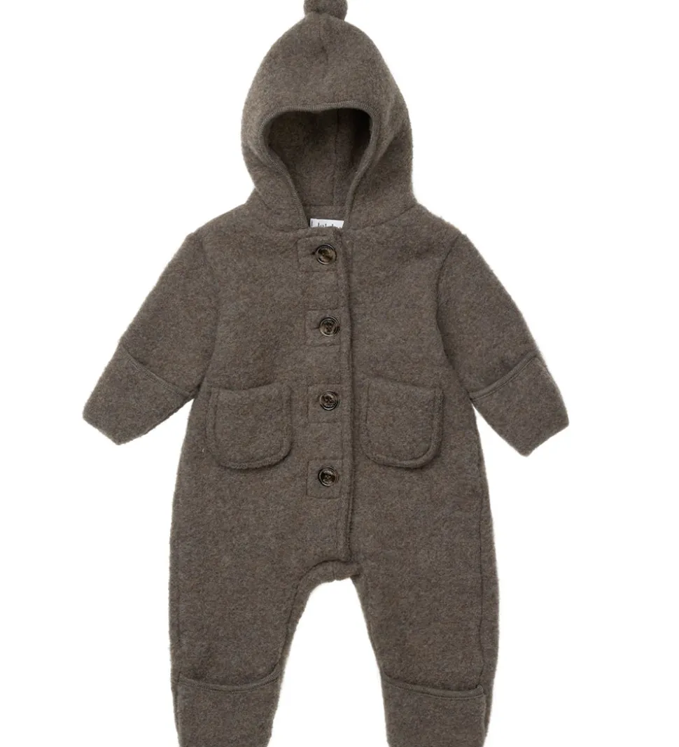 Køredragten har en hætte med en fin lille pompon i toppen, og den har smalle kanter og praktiske ombuk ved hænder og fødder. Køredragten lukkes ned ad fronten med store knapper, og fortil sidder det to søde lommer. Lalaby køredragten er fremstillet af lunt og dejligt merinould i en kraftig kvalitet.