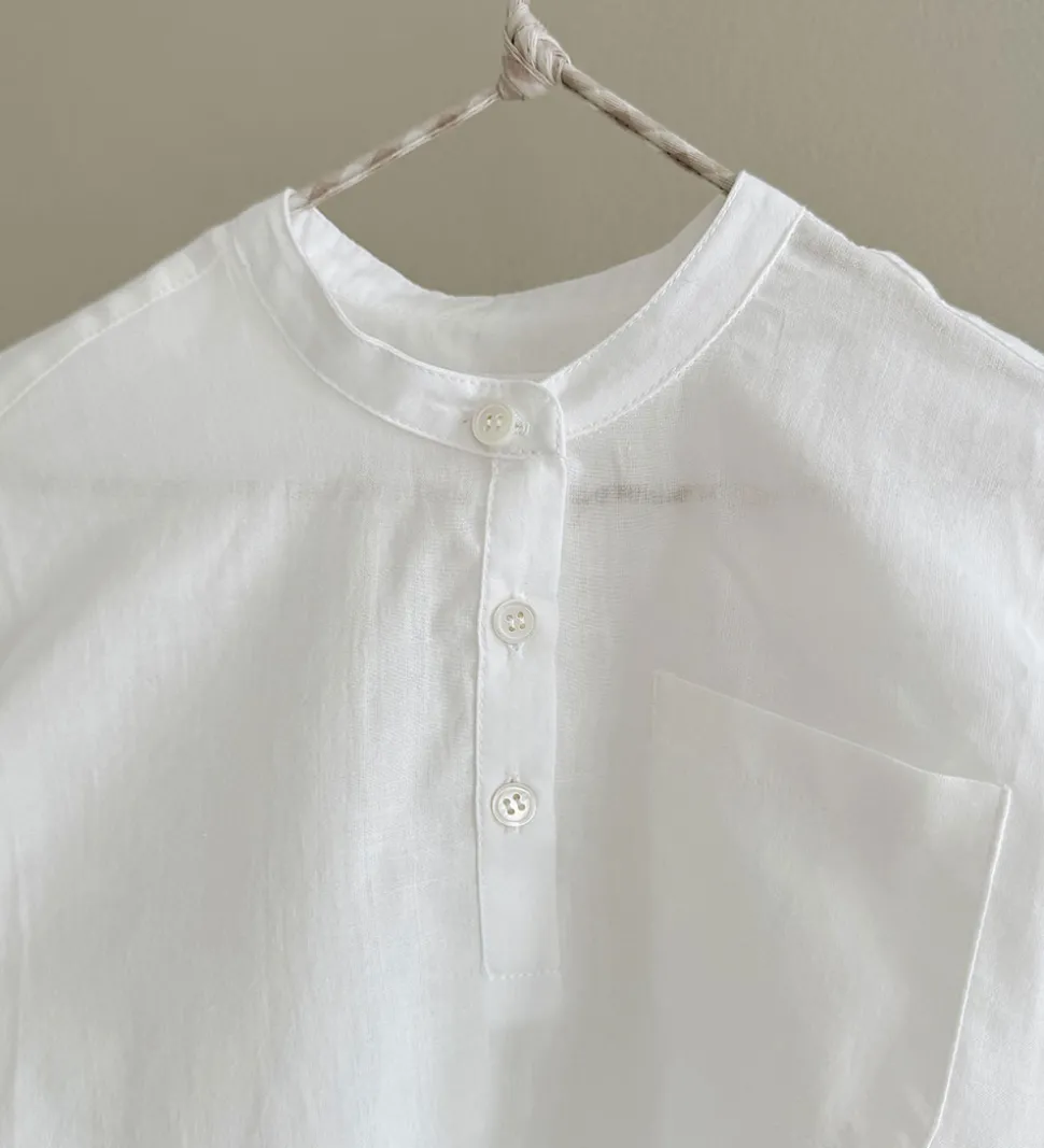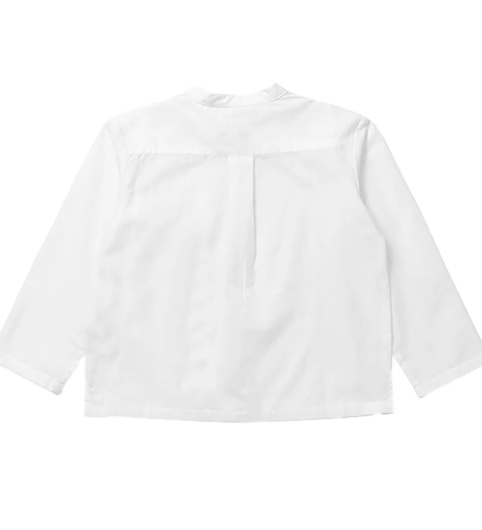 Lalaby skjorten tilbyder en løs pasform, der giver bevægelsesfrihed. Skjorten har en rund halsudskæring med en fin kinakrave, hvilket giver en afslappet pasform. Den åbnes fortil med knapper i en stolpelukning, og på venstre bryst er der en åben lomme.